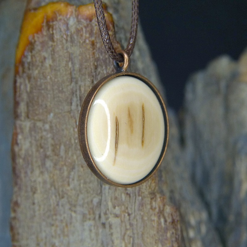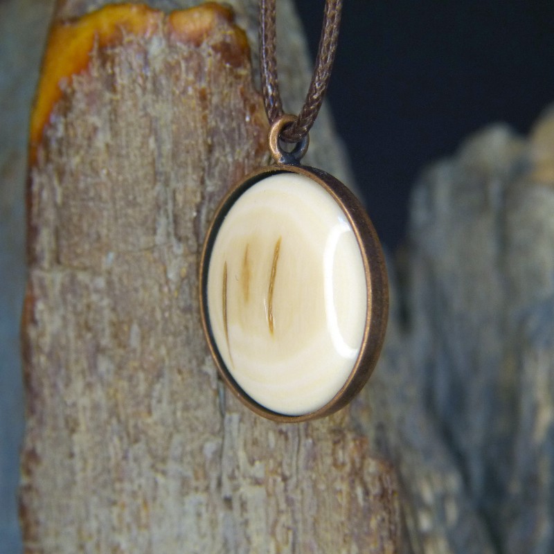 Runder Anhänger aus Kupfer im Antikfinish und einer Einlage aus Mammut von der Rinde mit bräunlichen Färbungen.