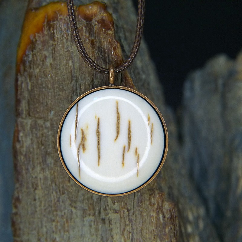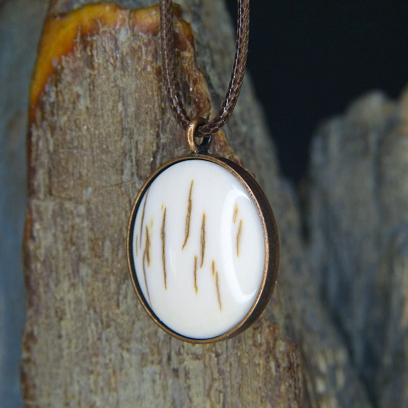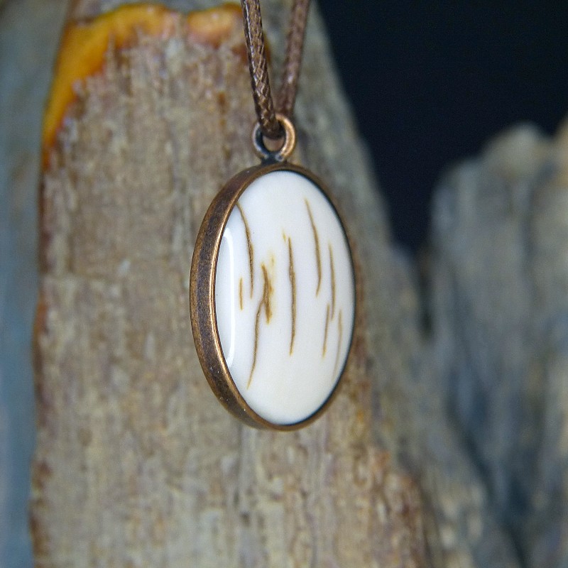 Runder Anhänger aus Kupfer im Antikfinish und einer Einlage aus heller Mammut-Rinde.