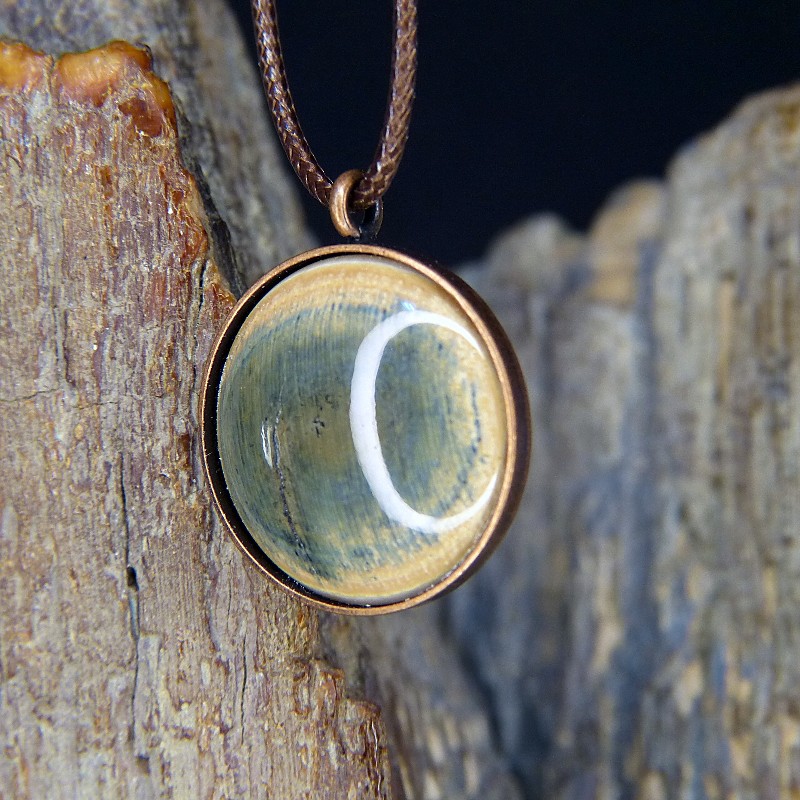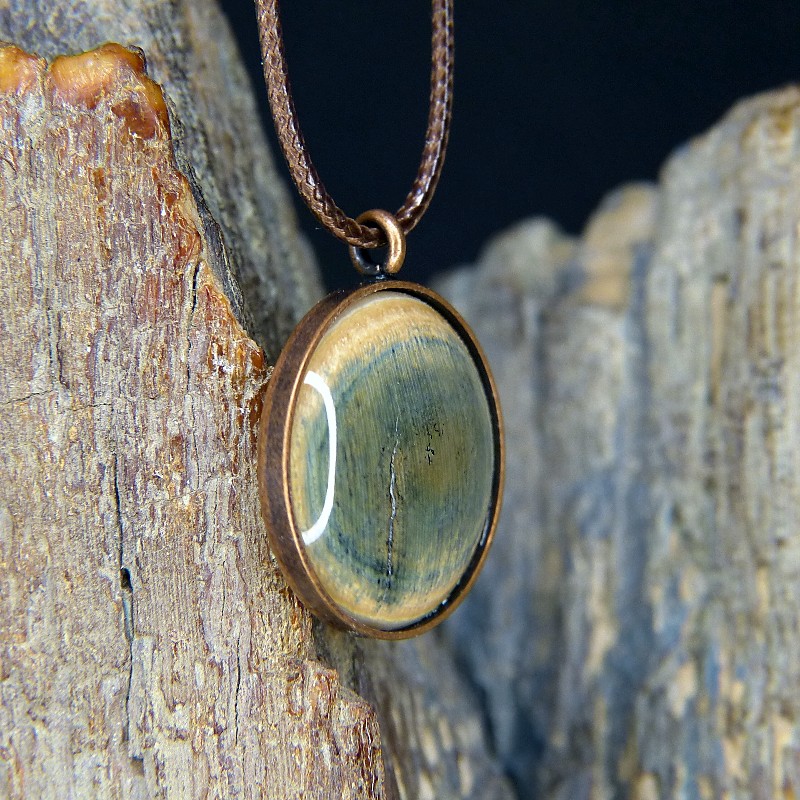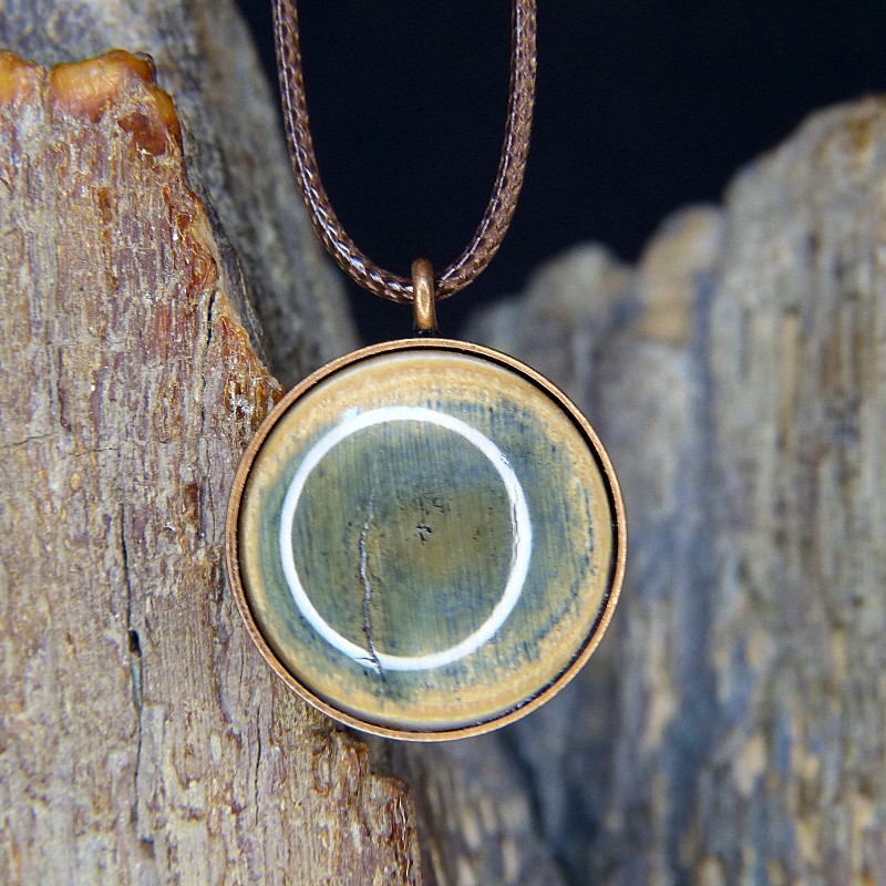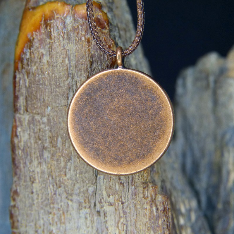 Runder Anhänger aus Kupfer im Antikfinish und einer Einlage aus Mammut-Elfenbein mit seltener grünlicher Färbung, entstanden durch die Ablagerung von Kupfer.
