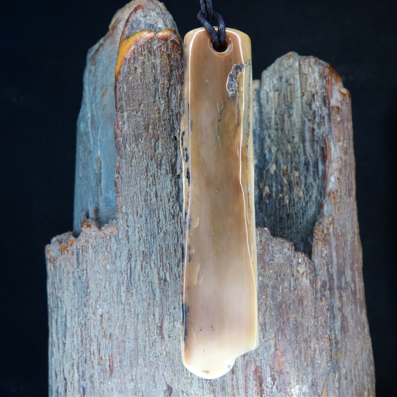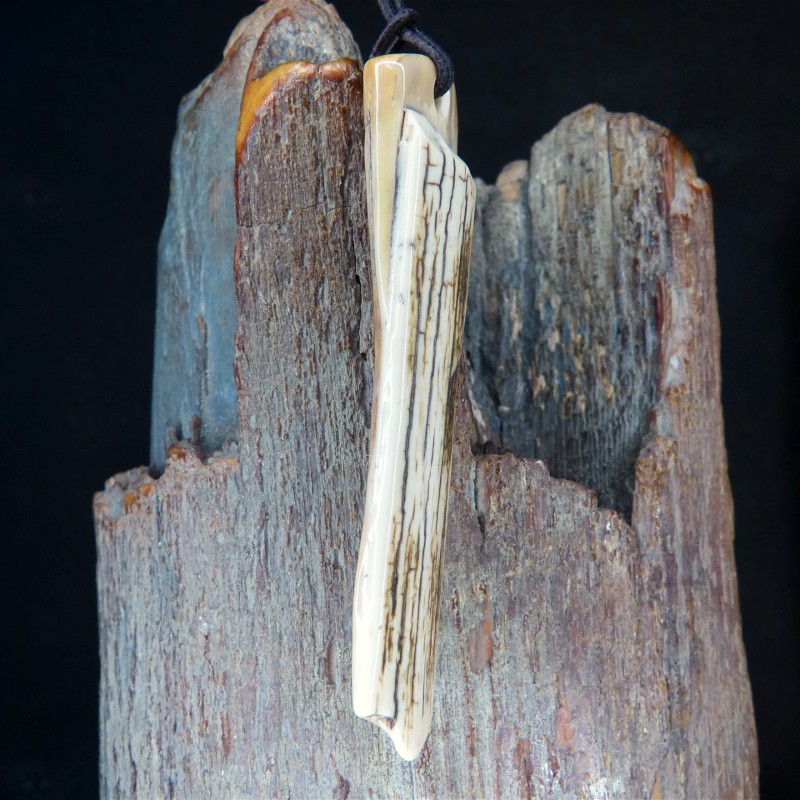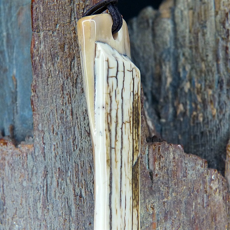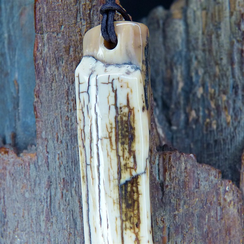 Langer Anhänger aus fossilem Mammut-Elfenbein mit natürlichen Färbungen, entstanden durch Verwitterung und eingelagerter Mineralien.