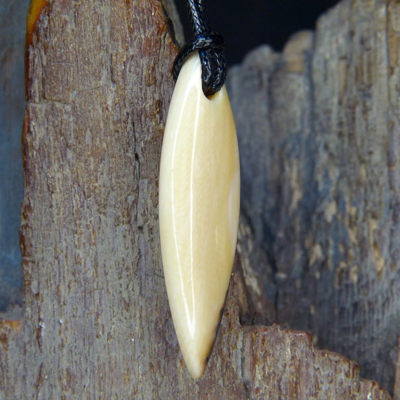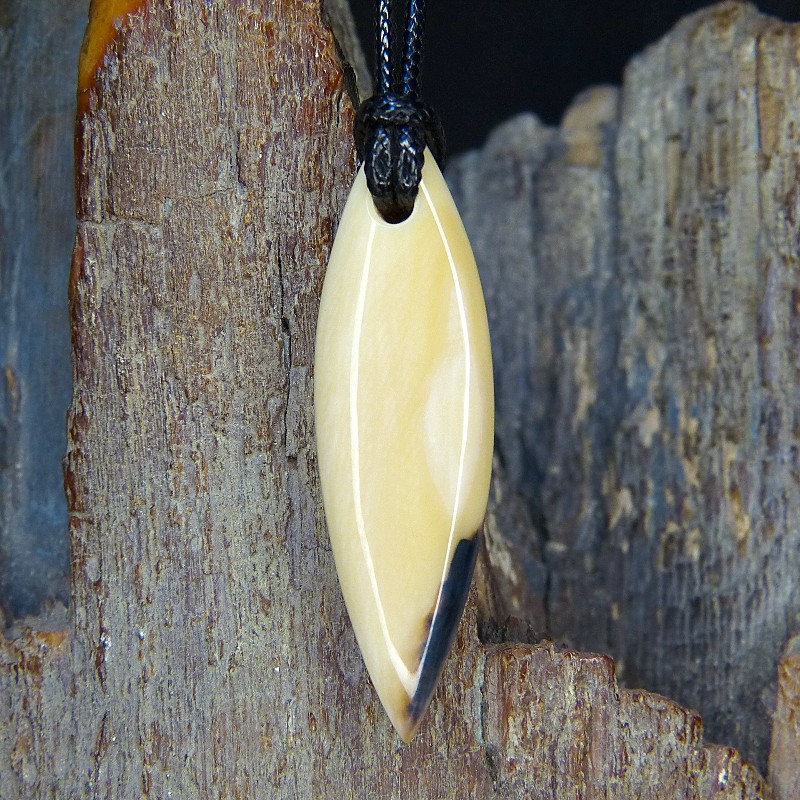Navetteförmig geschliffener Anhänger aus cremigem Mammut-Elfenbein mit dunkler Ecke.