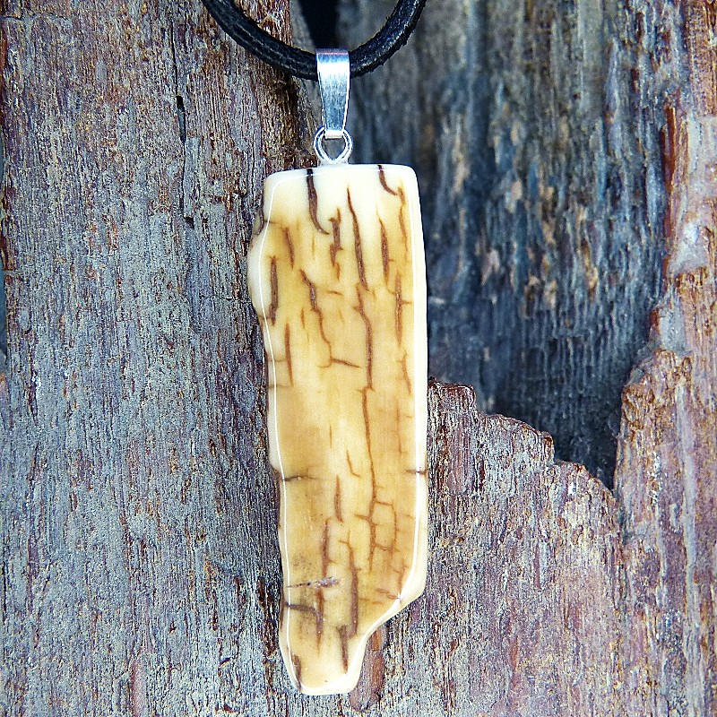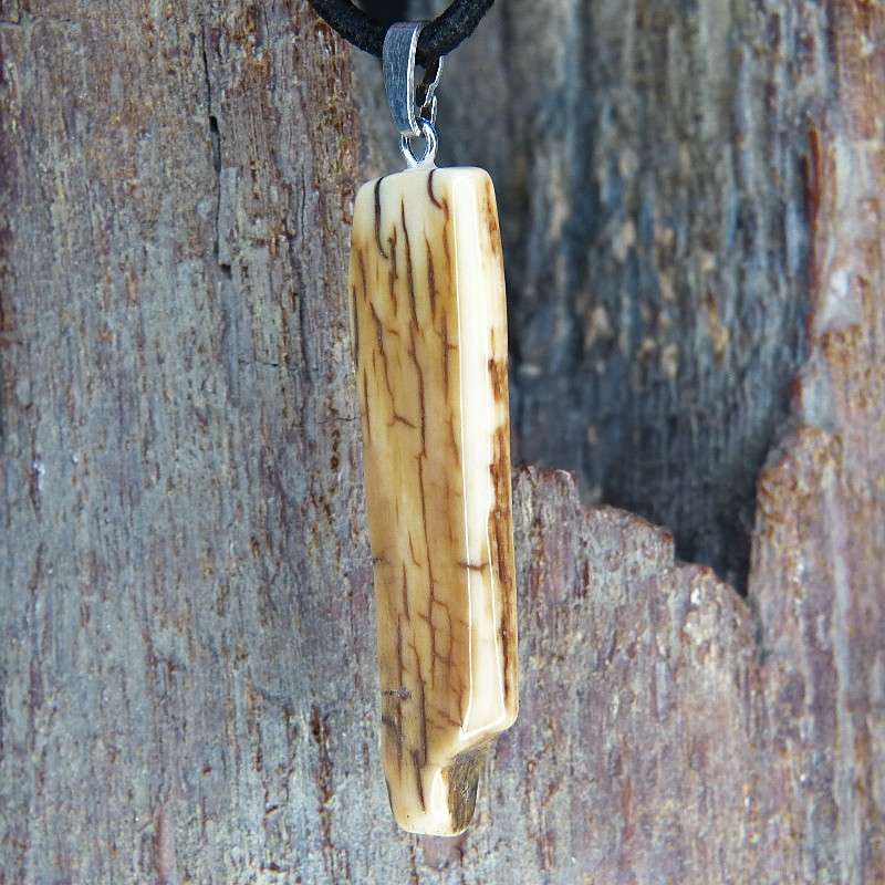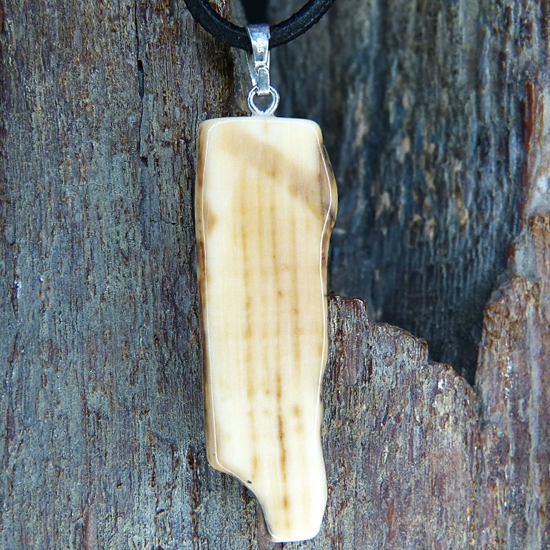 Anhänger aus cremigem Mammut-Elfenbein mit schöner natürlicher Rindenfärbung und gerundeter Bruchkante.