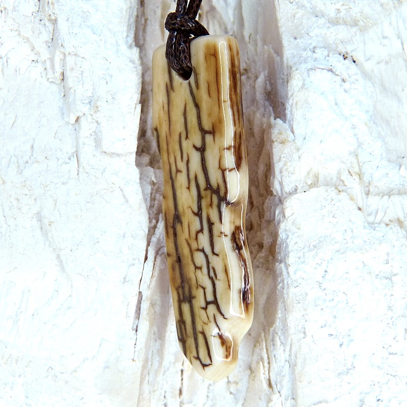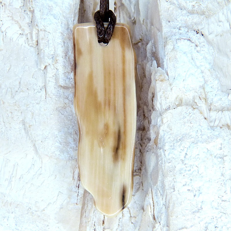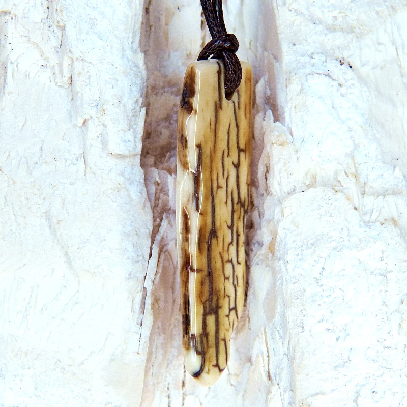 Anhänger aus fossilem Mammut-Elfenbein mit schöner Rindenfärbung und abgerundeter Bruchkante.