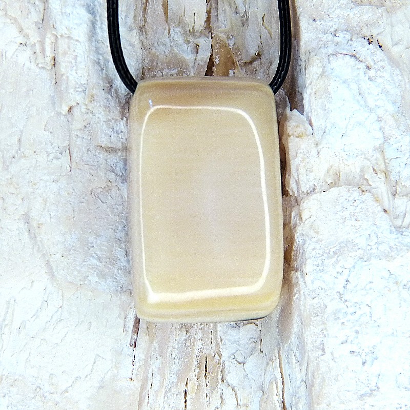 Der Anhänger hat eine Größe von ca. 36 x 22 x 12 mm und wird mit einer schwarzen gewachsten Baumwollschnur geliefert die über verstellbare Knoten von ca. 40 bis 70 cm variiert werden kann.