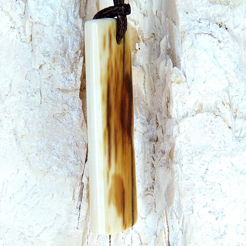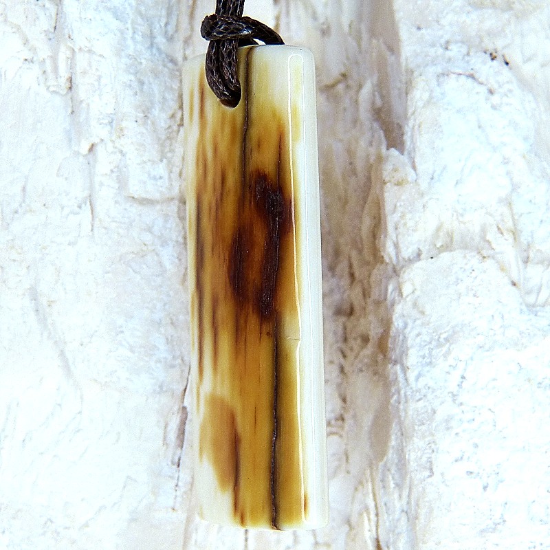 Anhänger aus fossilem Mammut-Elfenbein mit toller Rindenfärbung und heller Rückseite.