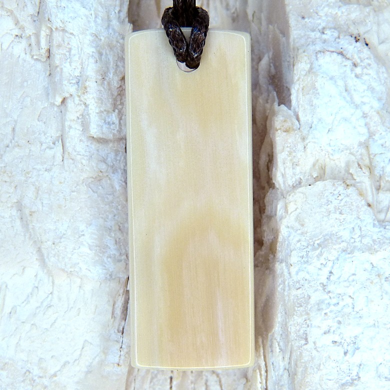 Er hat eine Größe von ca. 51 x 18,5 x 5 mm und wird mit einer braunen gewachsten Baumwollschnur geliefert die über verstellbare Knoten von ca. 40 bis 70 cm variiert werden kann.