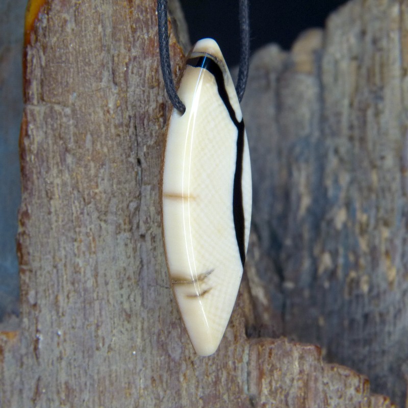 Navetteförmig geschliffener Anhänger aus Mammut-Elfenbein mit leichten Färbungen und ausgeprägter Maserung.
