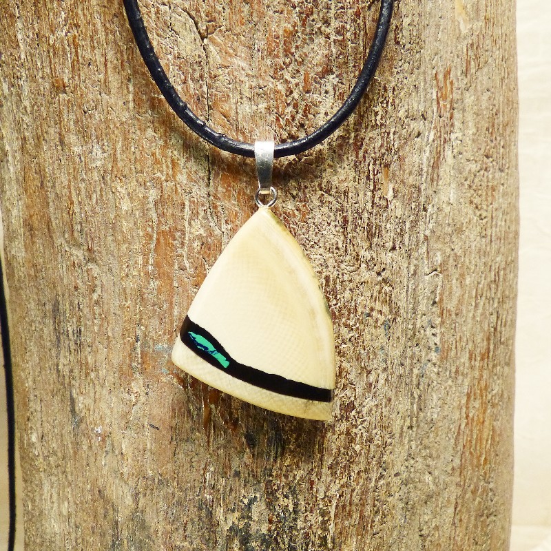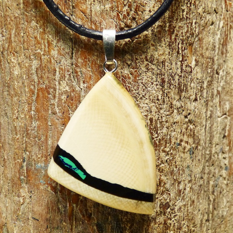 Cremefarbener Anhänger aus Mammut-Elfenbein mit starker Maserung sowie einer eingearbeiteten Intarsie aus rekonstruiertem Azurit