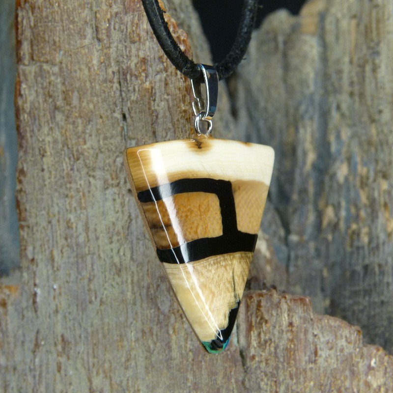 Dreieckiger Anhänger aus braunem Mammut-Elfenbein mit schöner Maserung. Als Intarsie wurde an der Spitze zusätzlich ein kleiner rekonstruierter grün/blauer Azurit eingearbeitet.