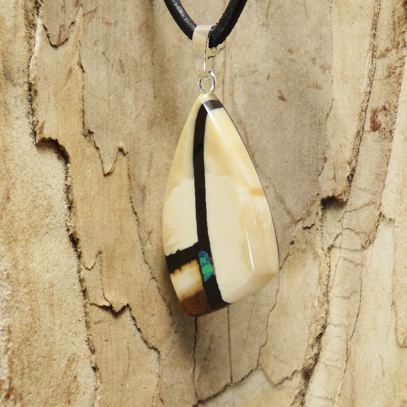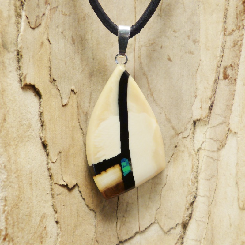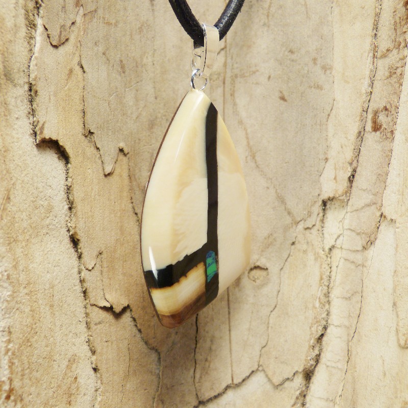 Anhänger aus hellem Mammut-Elfenbein mit brauner Ecke.