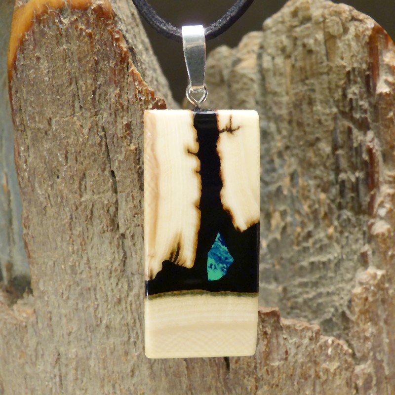 Intarsie aus rekonstruiertem Azurit. Er hat eine Größe von ca. 42 x 19 mm (ohne Öse) und wurde zur Stabilisierung mit Nussbaumholz