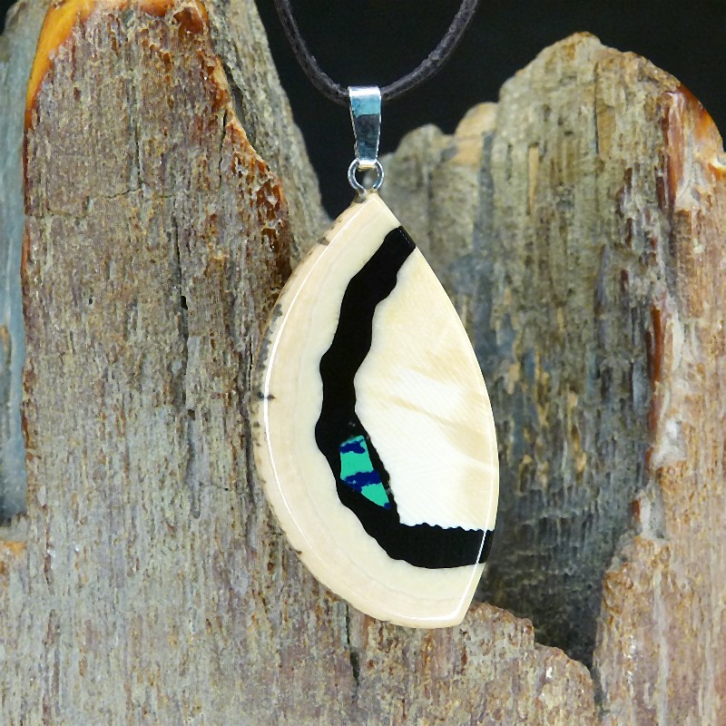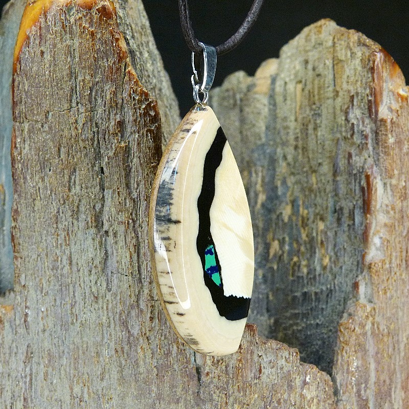 Anhänger aus cremefarbenem geflecktem Mammut-Elfenbein mit leichter Rindenfärbung. Als Intarsie wurde zusätzlich ein rekonstruierter grün/blauer Azurit eingearbeitet.