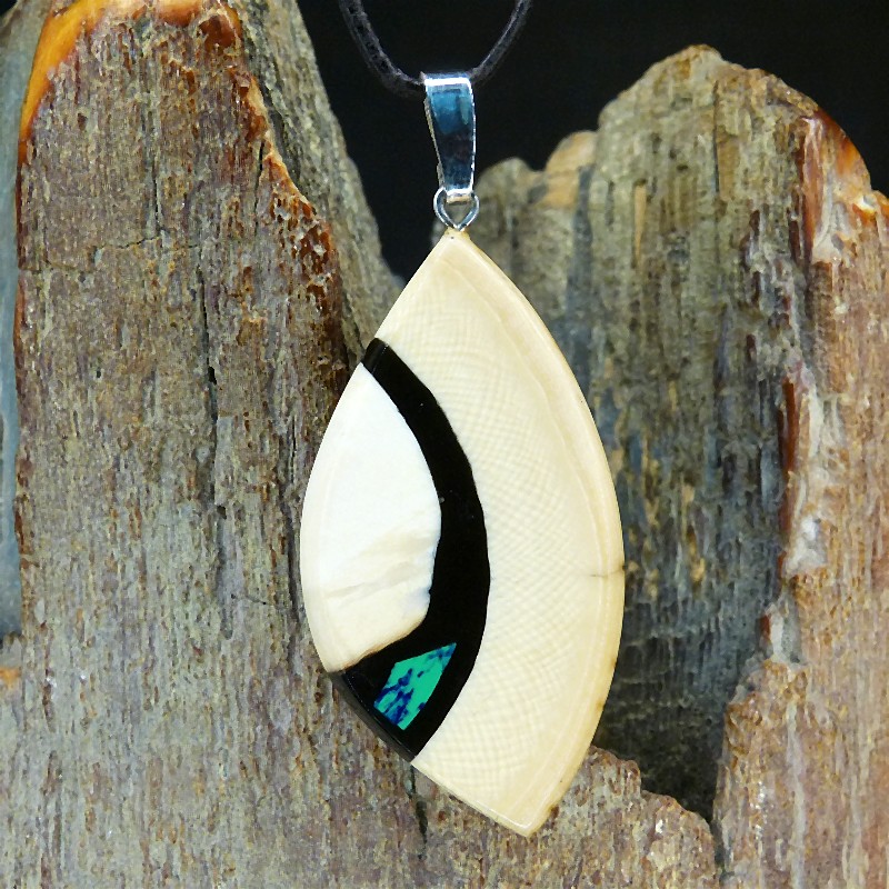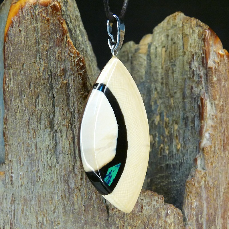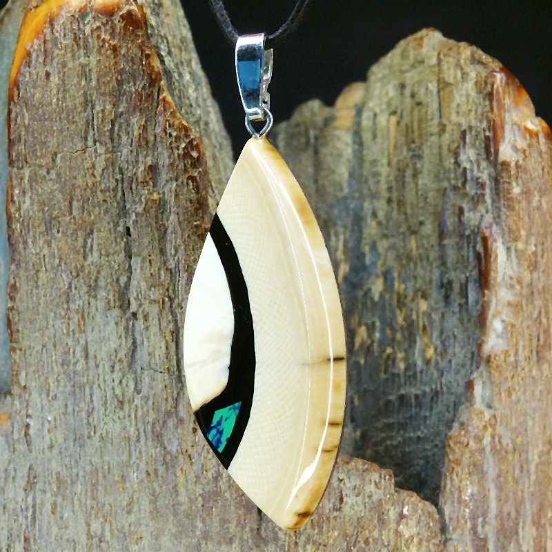 Anhänger aus cremefarbenem Mammut-Elfenbein mit schöner Rindenfärbung und ausgeprägter Maserung. Als Intarsie wurde zusätzlich ein rekonstruierter grün/blauer Azurit eingearbeitet.