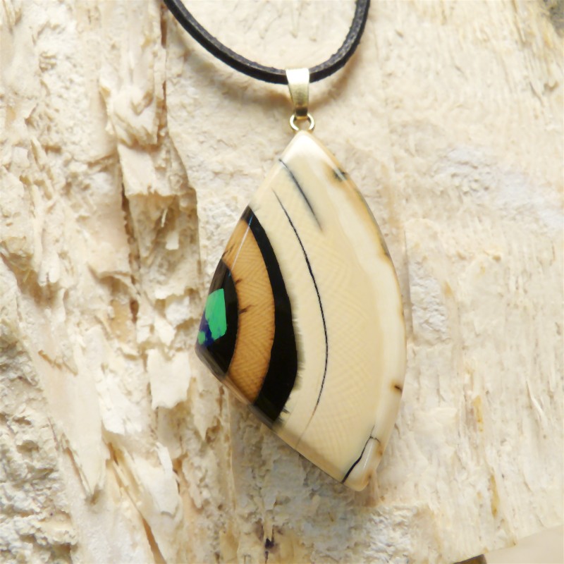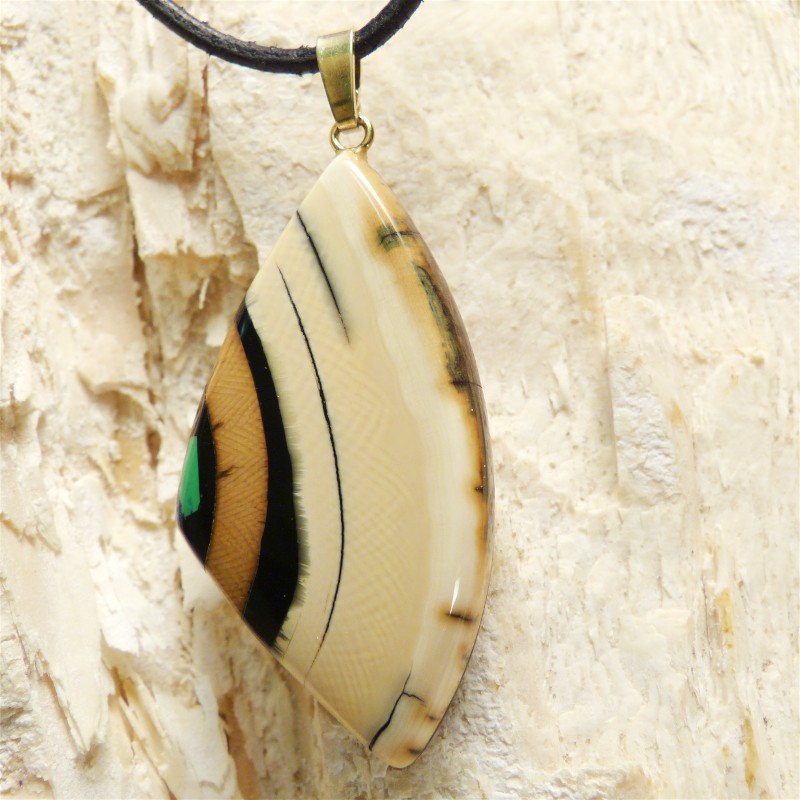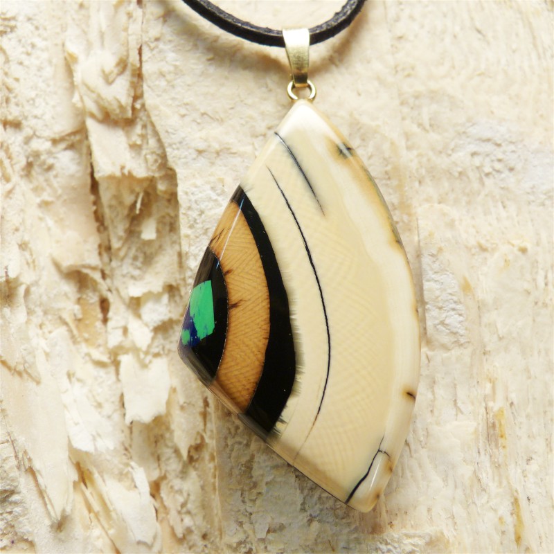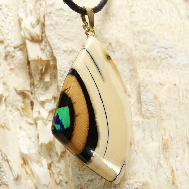 Anhänger aus cremefarbenem Mammut-Elfenbein mit schöner Rindenfärbung und ausgeprägter Maserung. An der Seite wurde ein rekonstruierter grün/blauer Azurit als Intarsie eingearbeitet. Der Anhänger hat ohne Öse eine Größe von ca. 48 x 26 mm. Die Öse aus 925/-er Silber ist zusätzlich in einer Stärke von 3 Micron vergoldet und ist geeignet für Ketten oder Bänder bis zu einer Stärke von ca. 3 mm. Die Lieferung erfolgt ohne Band, dieses können Sie unter Zubehör separat bestellen.
