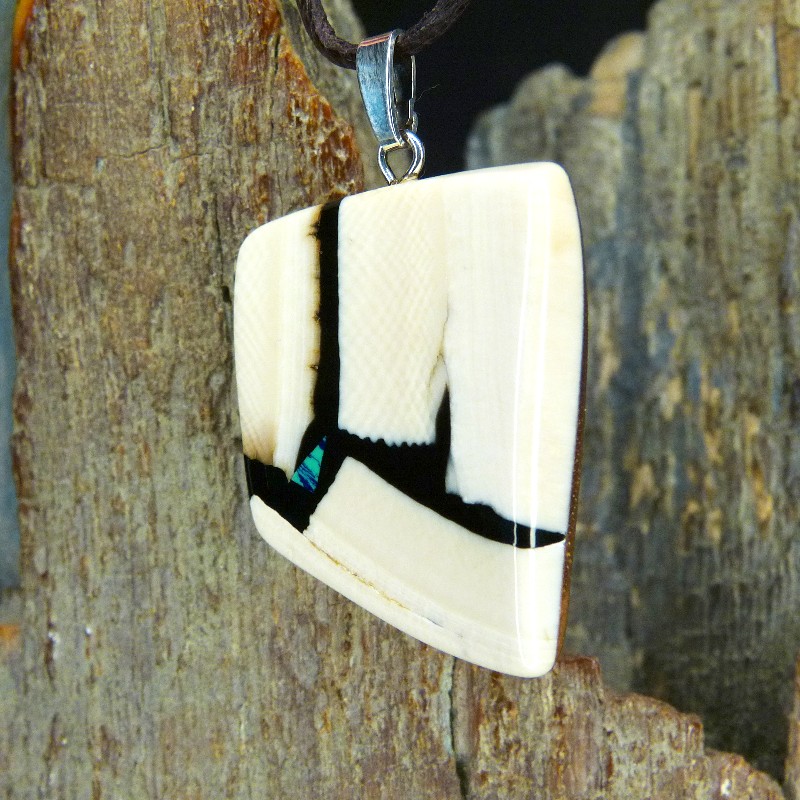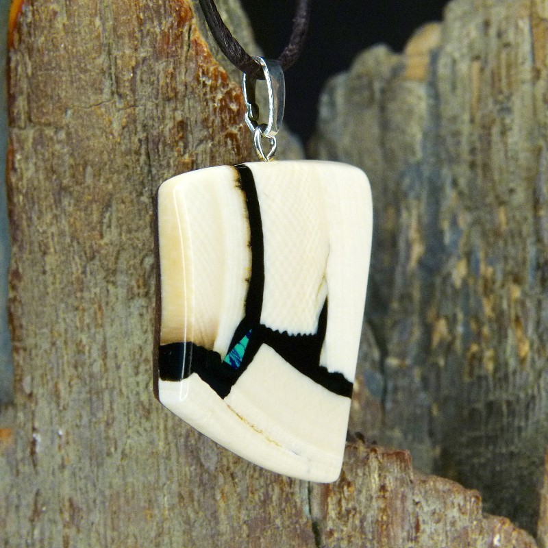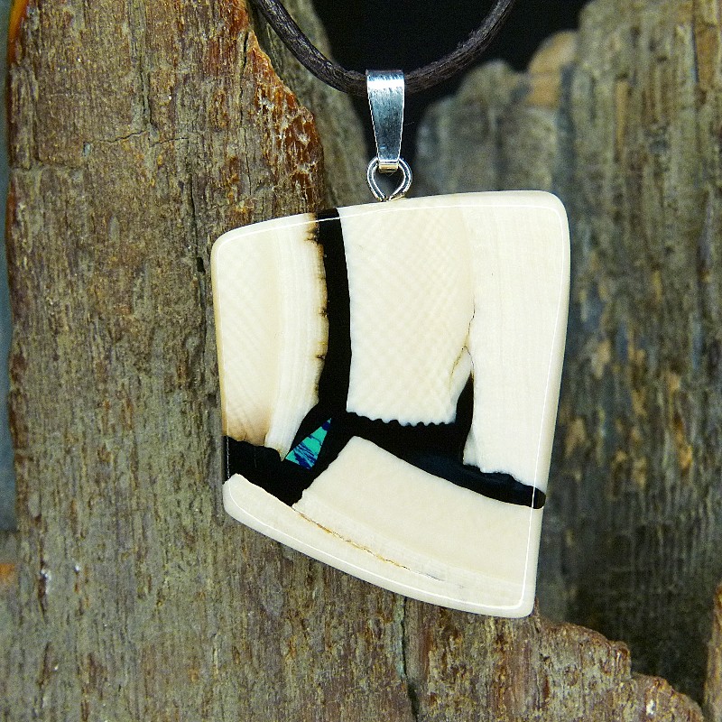 Kantiger Anhänger aus hellem Mammut-Elfenbein mit feiner Maserung. Als Intarsie wurde zusätzlich ein kleiner rekonstruierter grün/blauer Azurit eingearbeitet.