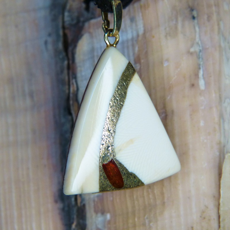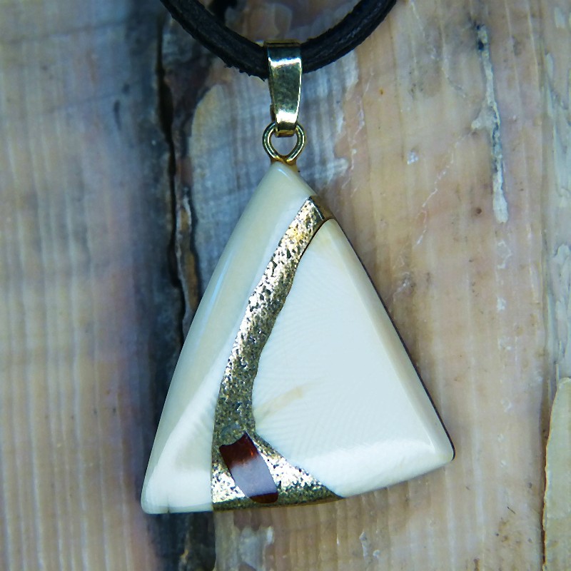 Anhänger aus hellem Mammut-Elfenbein mit feineer Maserung und einer Intarsie aus echtem Naturbernstein, eingebettet in einer goldglänzenden Metalllegierung.