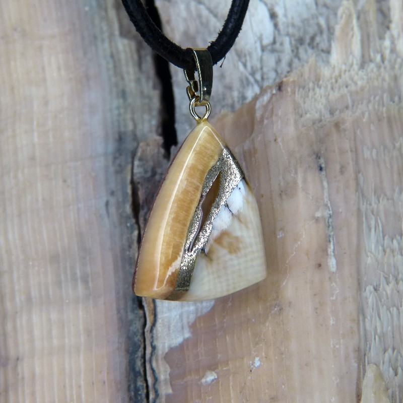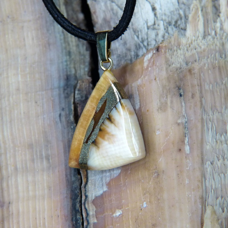 Kleiner Anhänger aus Mammut-Elfenbein mit tollen Färbungen einer Intarsie aus echtem Naturbernstein, eingebettet in einer goldglänzenden Metalllegierung.