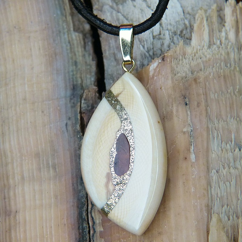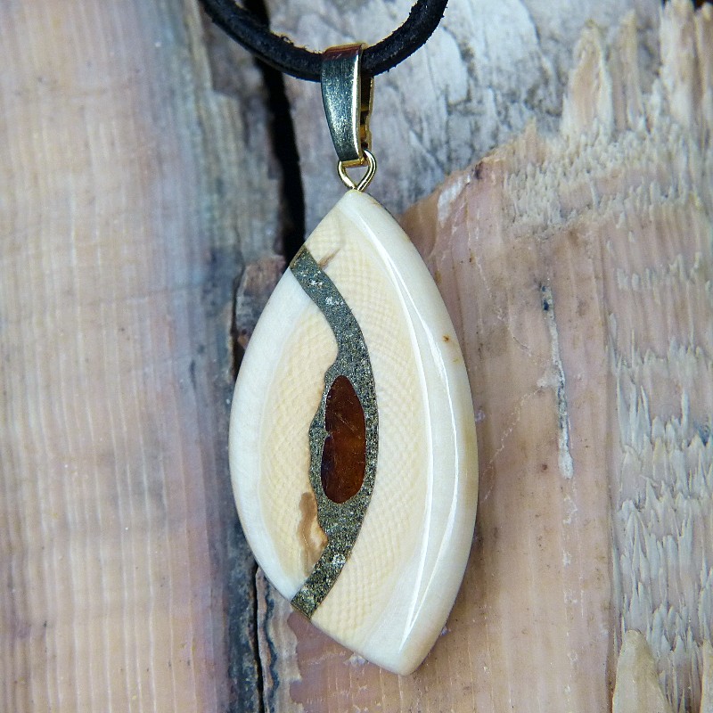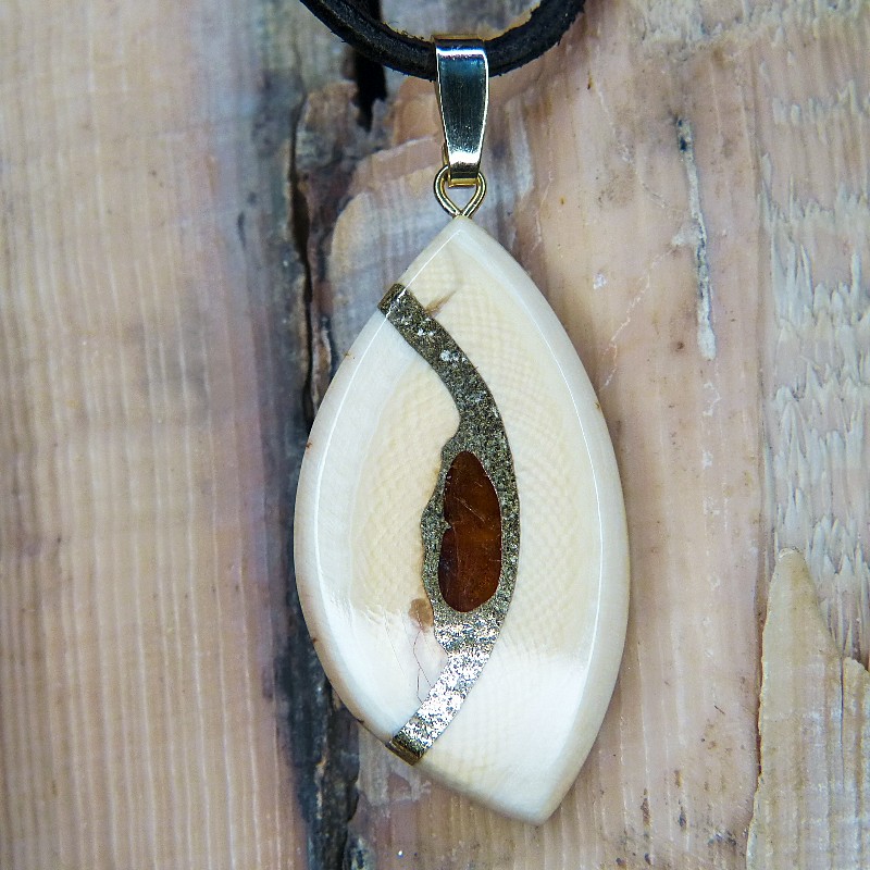 Anhänger aus cremefarbenem Mammut-Elfenbein mit feiner Maserung und einer Intarsie aus echtem Naturbernstein, eingebettet in einer goldglänzenden Metalllegierung.