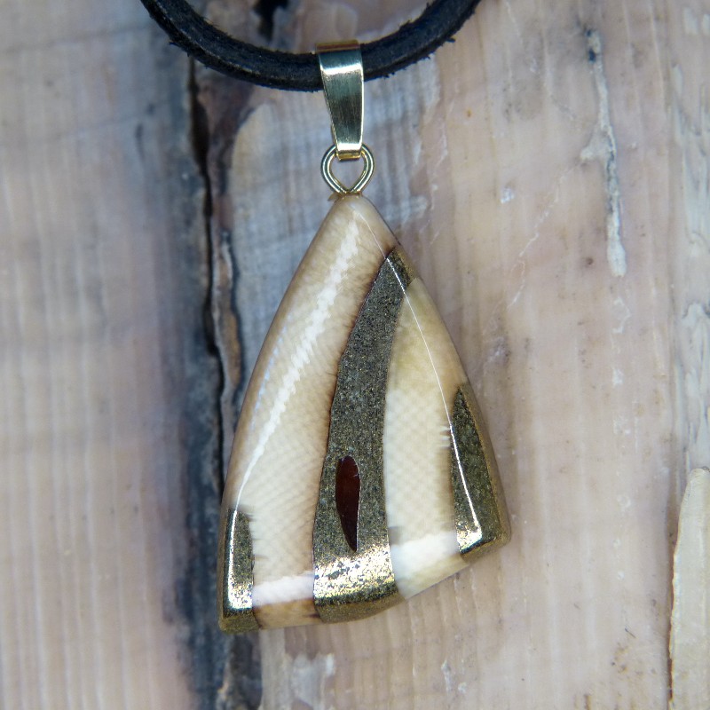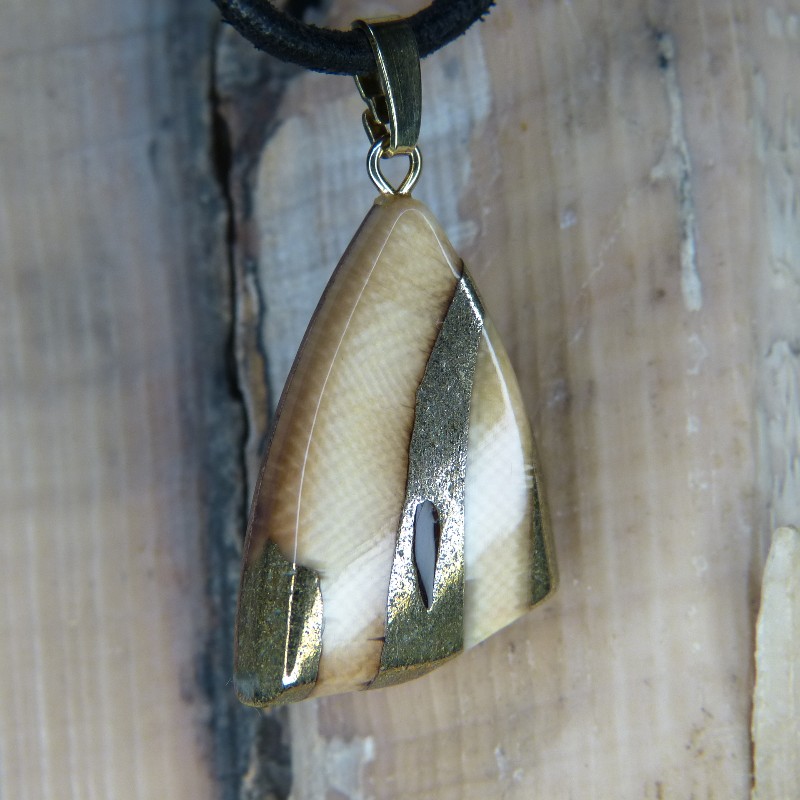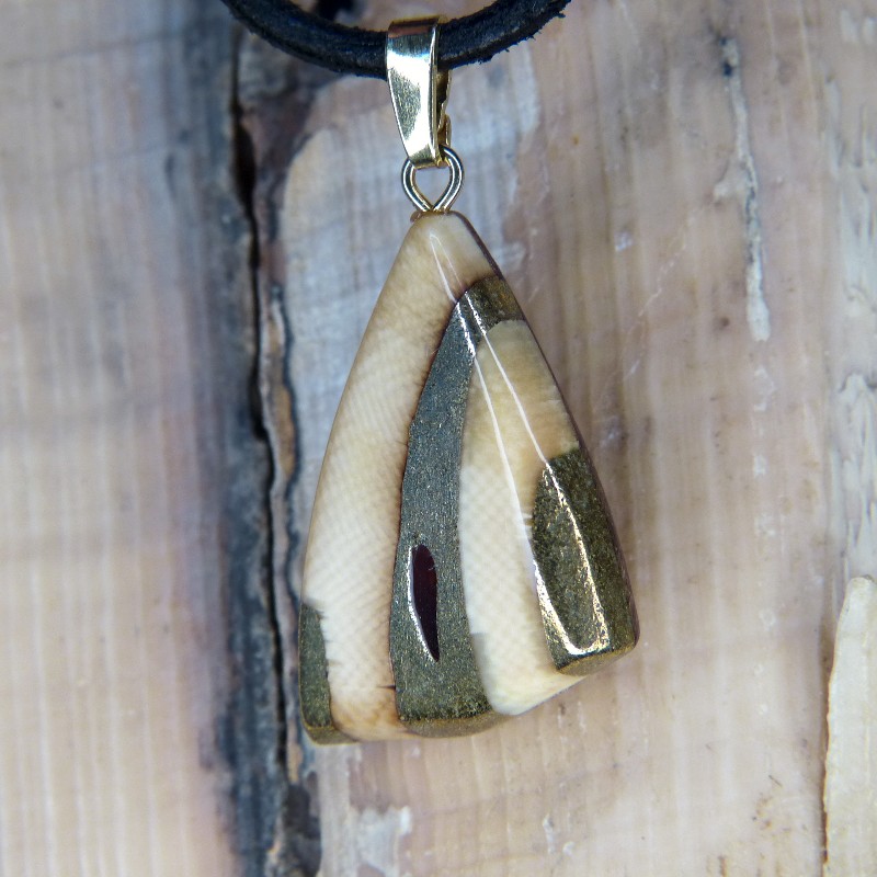 Kleiner Anhänger aus fein gemasertem Mammut-Elfenbein mit einer Intarsie aus echtem Naturbernstein, eingebettet in einer goldglänzenden Metalllegierung.