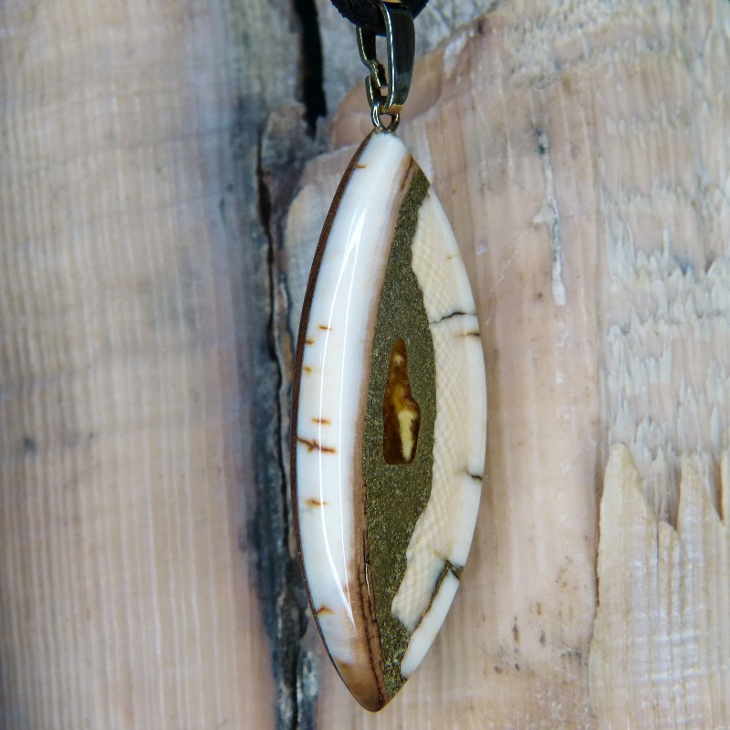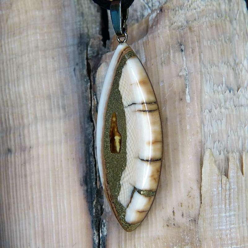 Schlanker Anhänger aus schön gemasertem Mammut-Elfenbein mit einer Intarsie aus echtem Naturbernstein, eingebettet in einer goldglänzenden Metalllegierung. Die schönen Färbungen, entstanden durch jahrtausende lange mineralische Ablagerungen, geben dem Material heute seinen unverwechselbaren Charakter.