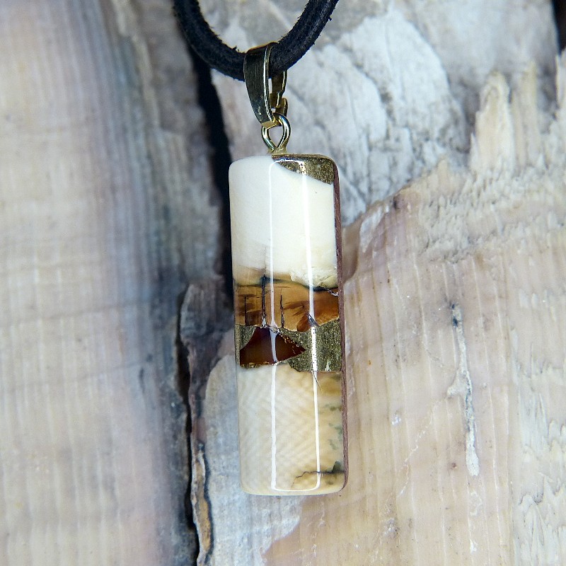 Stabförmiger Anhänger aus Mammut-Elfenbein mit schöner Maserung und einer Intarsie aus echtem Naturbernstein, eingebettet in einer goldglänzenden Metalllegierung.