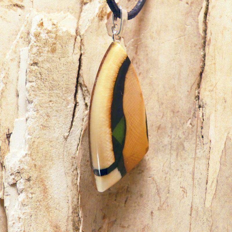 Der Anhänger hat ohne Öse eine Größe von ca. 38 x 19 mm und ist zur Stabilisierung auf der Rückseite mit Nussbaumholz hinterlegt. Die Aufhängung