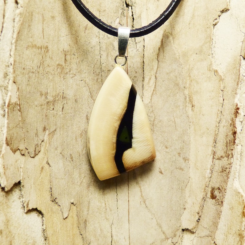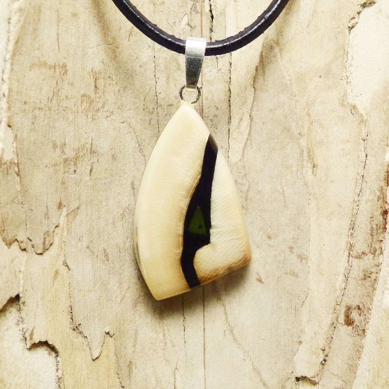 Kleiner cremefarbener Anhänger aus Mammut-Elfenbein mit kleiner Intarsie aus rekonstruierter Jade.
