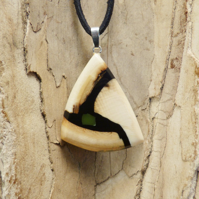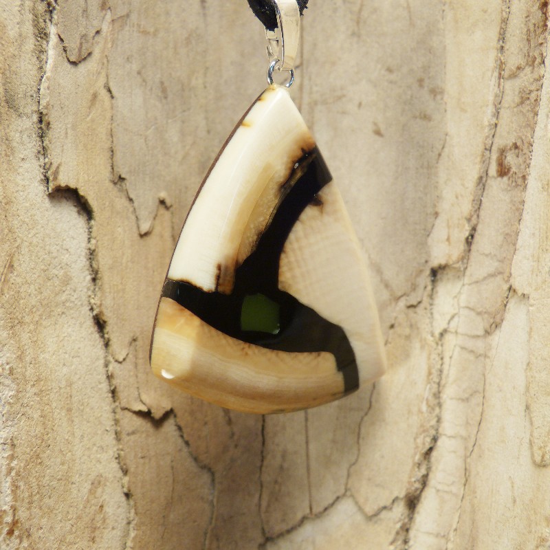 Dreieckig geschliffener Anhänger aus cremefarbenem und braunem Mammut-Elfenbein.