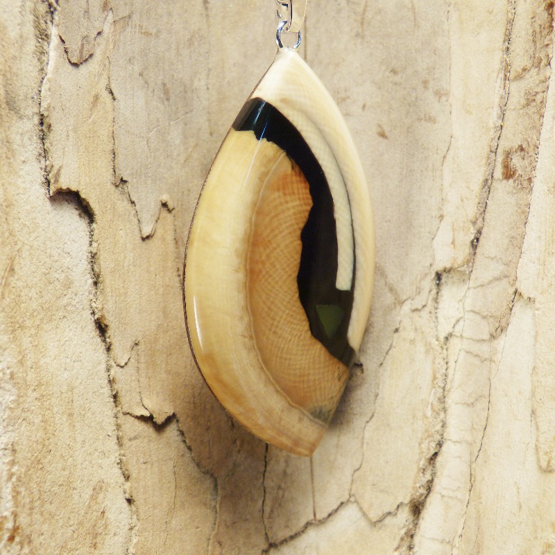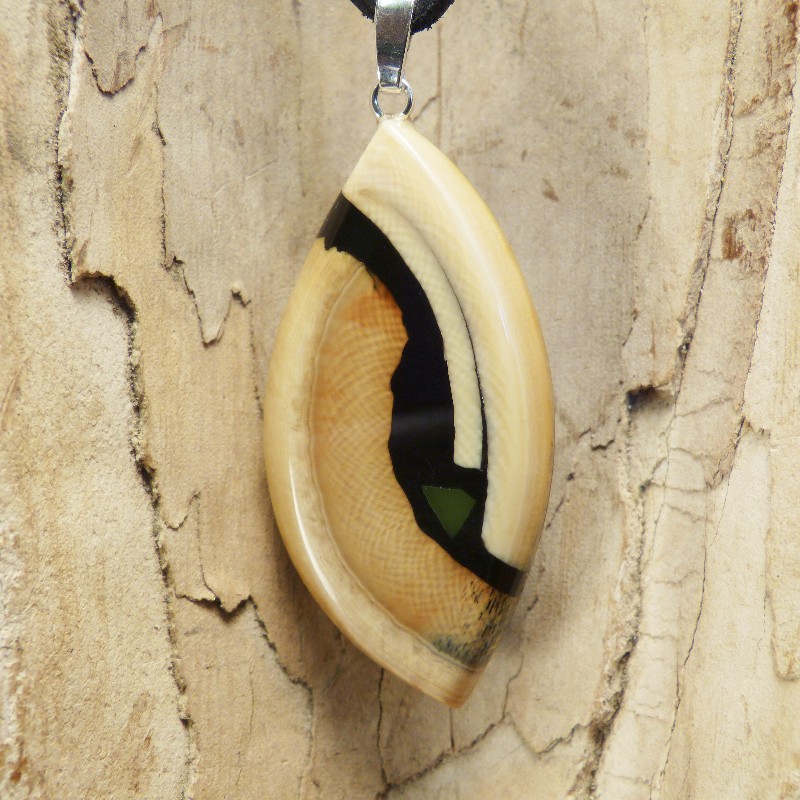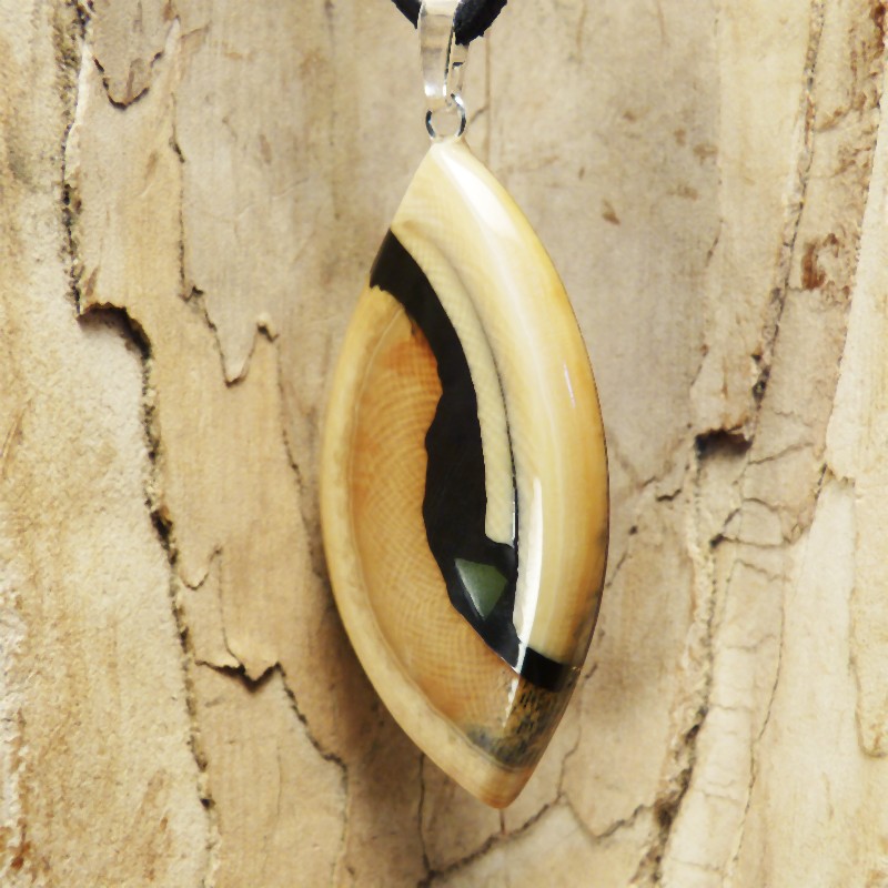 Navetteförmig geschliffener Anhänger aus cremefarbenem und braunem Mammut-Elfenbein mit feiner Maserung.
