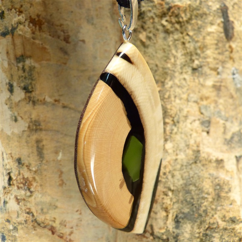 Mammut-Elfenbein mit schönen Färbungen und eingearbeiteter Intarsie aus rekonstruierter Jade. Er hat ohne Öse eine Größe von ca. 47 x 26 mm und ist zur