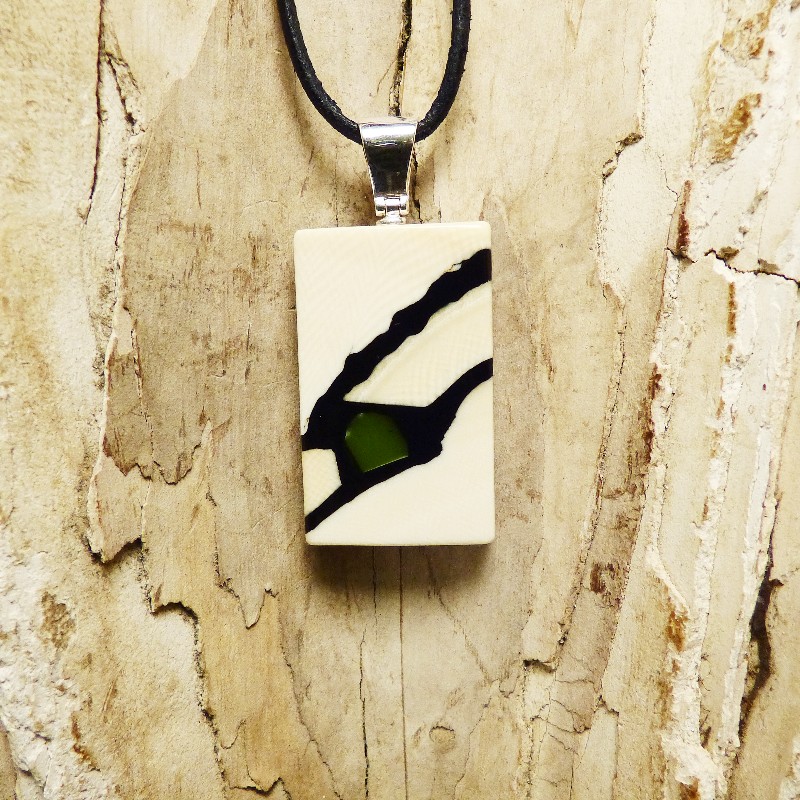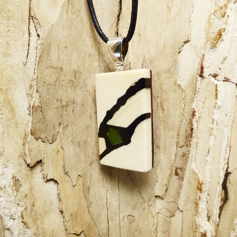 Stark gemaserter Anhänger aus cremefarbenem Mammutelfenbein mit Intarsie aus rekonstruierter Jade.