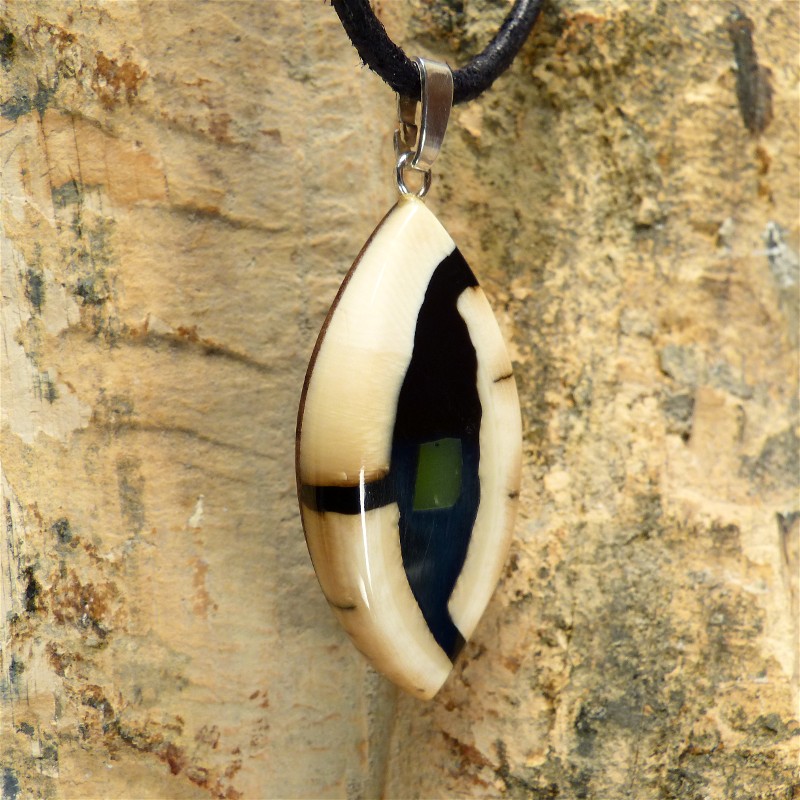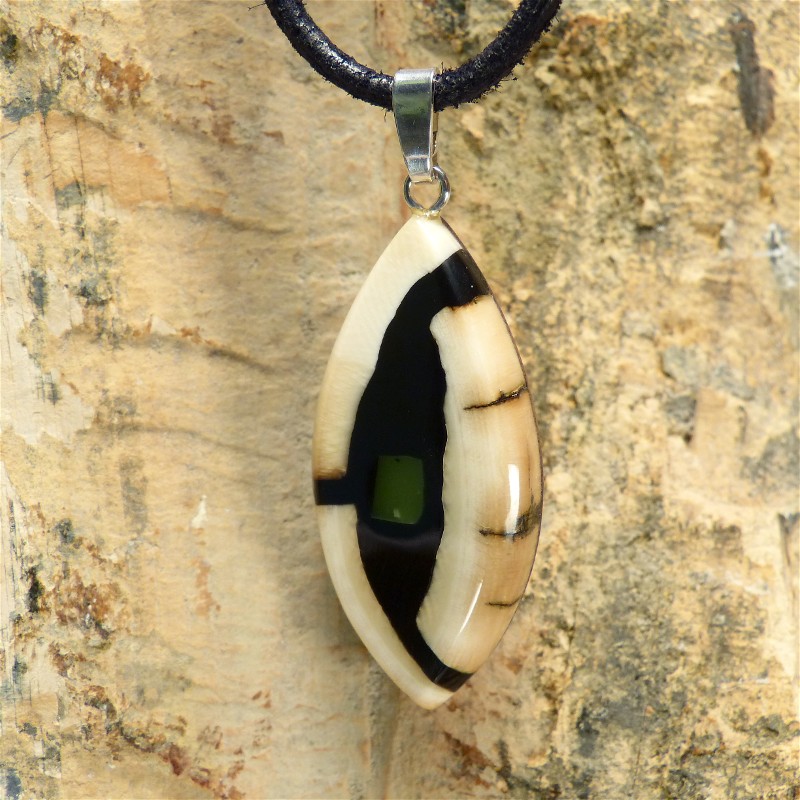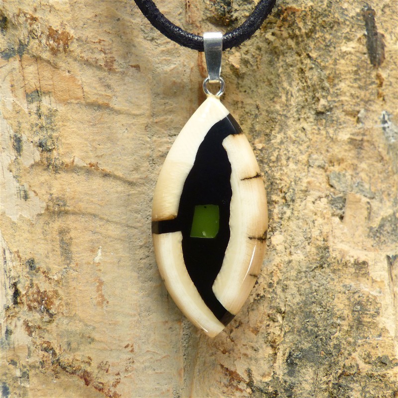 Kleiner navetteförmig geschliffener Anhänger aus cremefarbenem Mammut-Elfenbein mit brauner Rindenfärbung und eingearbeiteter Intarsie aus rekonstruierter Jade.