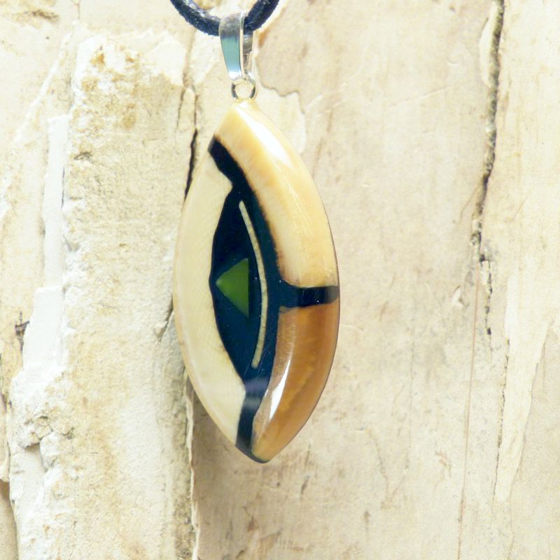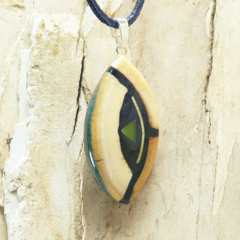 Navetteförmig geschliffener Anhänger aus beige/braunem Mammut-Elfenbein mit feiner