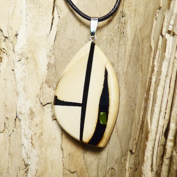 Anhänger aus cremefarbenem Mammut-Elfenbein mit feiner Maserung. Als Intarsie wurde eine kleine rekonstruierte Jade eingearbeitet, wobei die Rückseite zur Stabilisierung mit Nussbaumholz hinterlegt wurde. Die Größe
