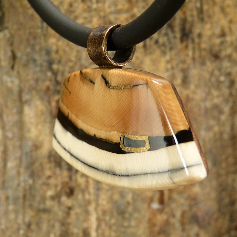 Auffälliger Quer-Anhänger aus schön gemasertem Mammut-Elfenbein mit dunkelbraunen Färbungen. Als Intarsie wurde zusätzlich eine kleine Jade eingearbeitet. Der Anhänger hat eine Größe von ca. 54 x 27mm und ist rückseitig zur Stabilisierung it Nussbaumholz hinterlegt. Die fest montierte und massiv gegossener Öse aus Bronze im Antikfinish eignet sich für Bänder oder Ketten bis zu einem Durchmesser von ca. 6,5mm. Die Lieferung erfolgt ohne Band, dieses können Sie unter Zubehör separat bestellen.