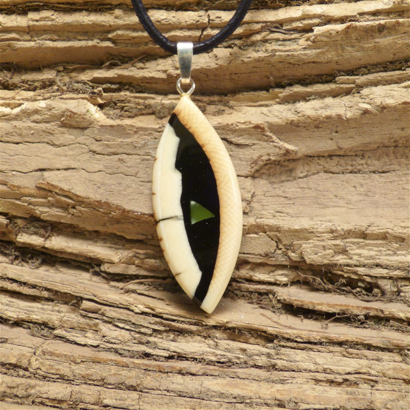 Schlanker Anhänger aus cremefarbenem Mammut-Elfenbein mit feiner Maserung. Als Intarsie wurde zusätzlich eine kleine rekonstruierte Jade eingearbeitet.