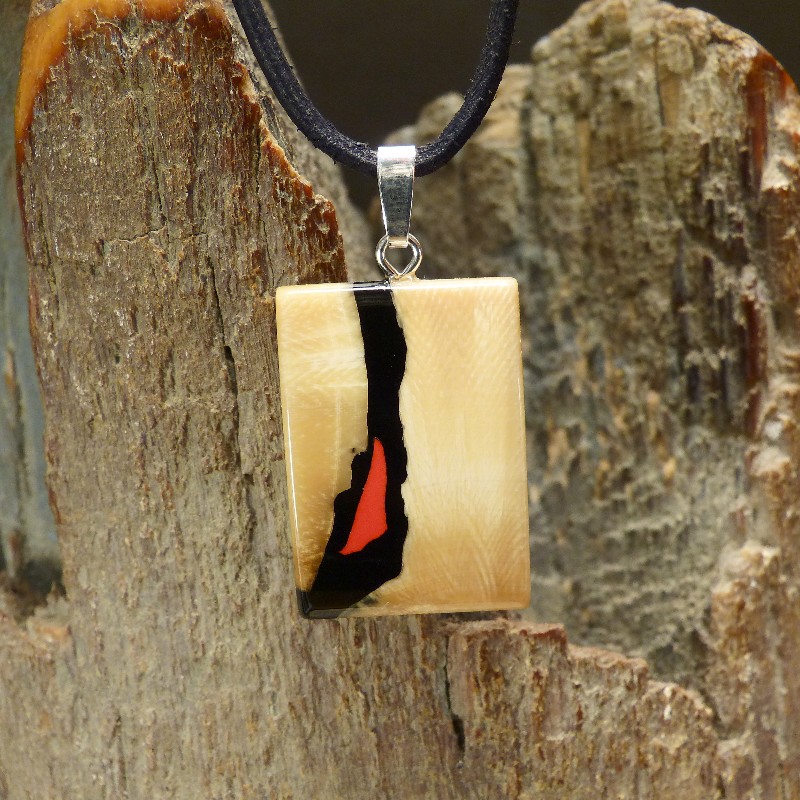 Intarsie aus rekonstruierter Koralle. Er hat eine Größe von ca. 27 x 19 mm (ohne Öse) und wurde zur Stabilisierung mit Nussbaumholz