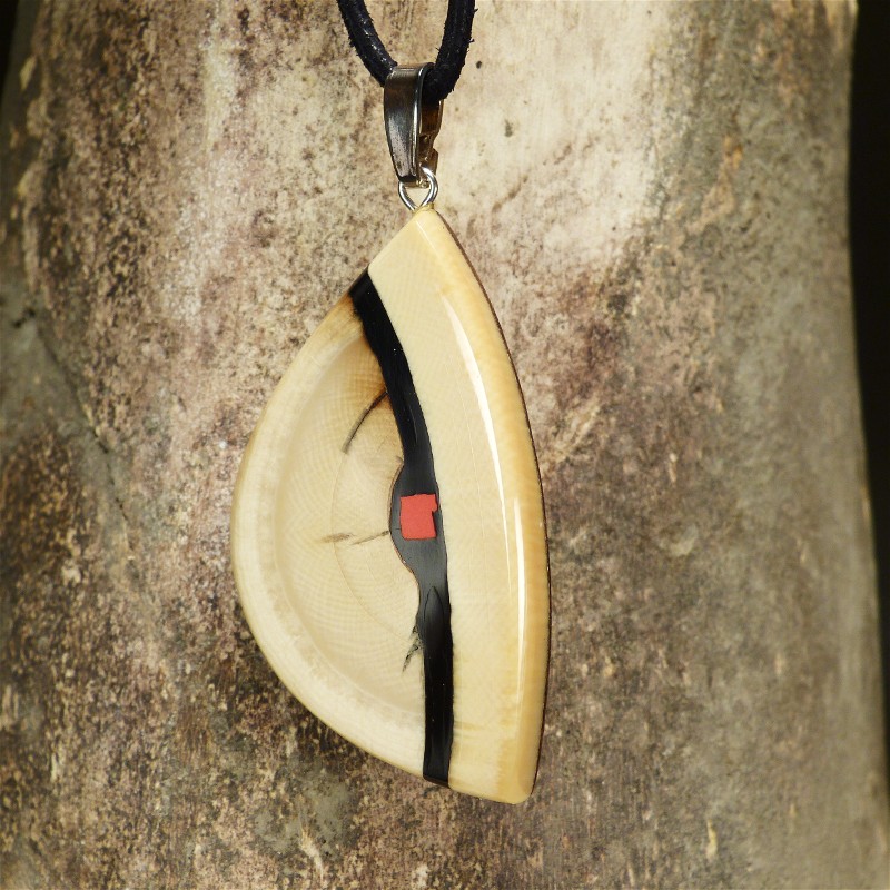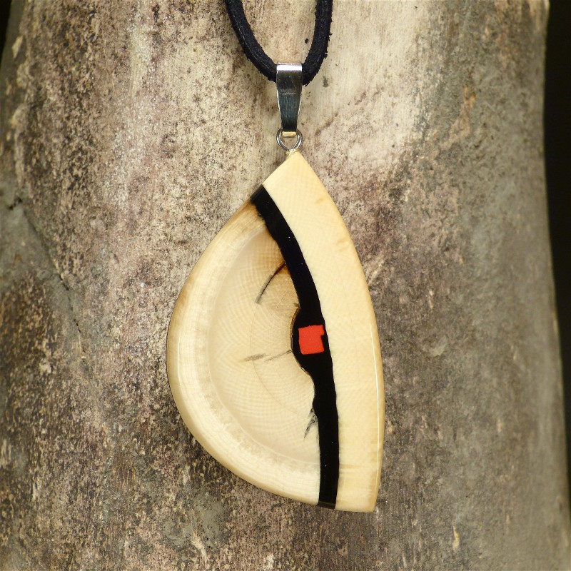 Anhänger aus cremefarbenem Mammut-Elfenbein mit feiner Maserung. Als Intarsie wurde zusätzlich eine kleine rekonstruierte Koralle eingesetzt. Der Anhänger hat ohne Öse eine Größe von ca. 51 x 30 mm und ist zur Stabilisierung auf der Rückseite mit Nussbaumholz hinterlegt. Die Aufhängung aus 925/-er Silber eignet sich für Ketten oder Bänder bis zu einer Stärke von ca. 3,5 mm. Die Lieferung erfolgt ohne Band, dieses können Sie unter Zubehör separat bestellen.