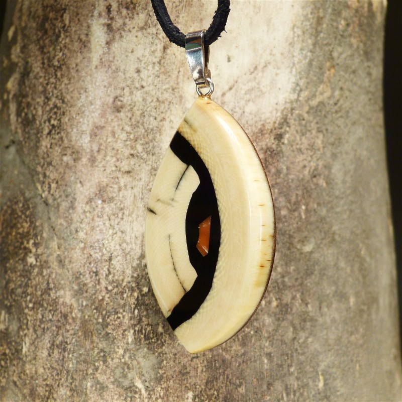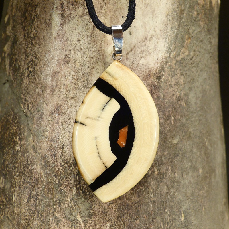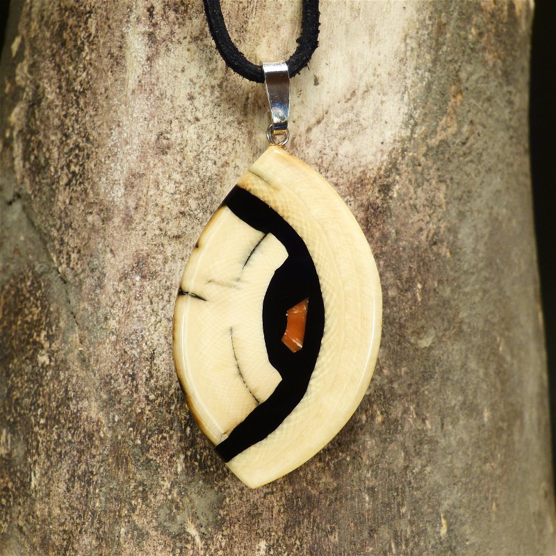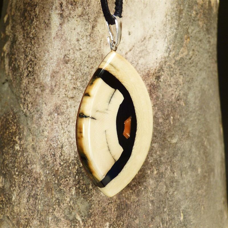 Fein gemaserter Anhänger aus cremefarbenem Mammut-Elfenbein und schöner Außenrinde. Als Intarsie wurde zusätzlich eine rekonstruierte Koralle eingesetzt.
