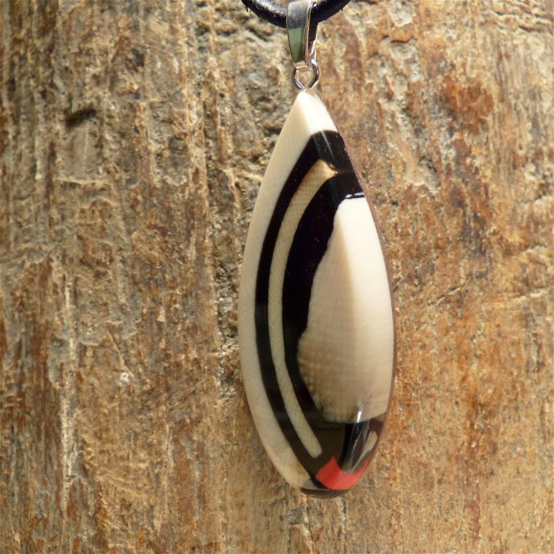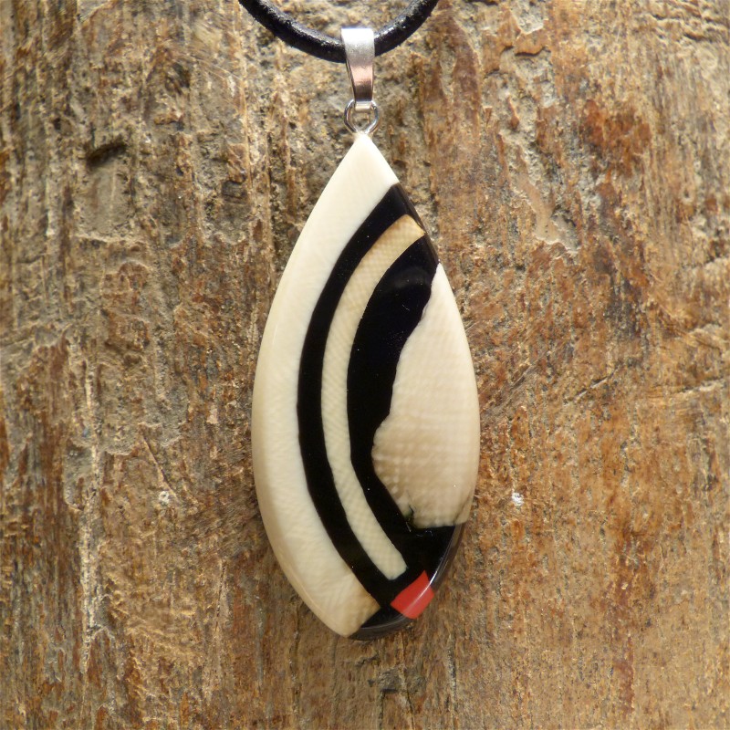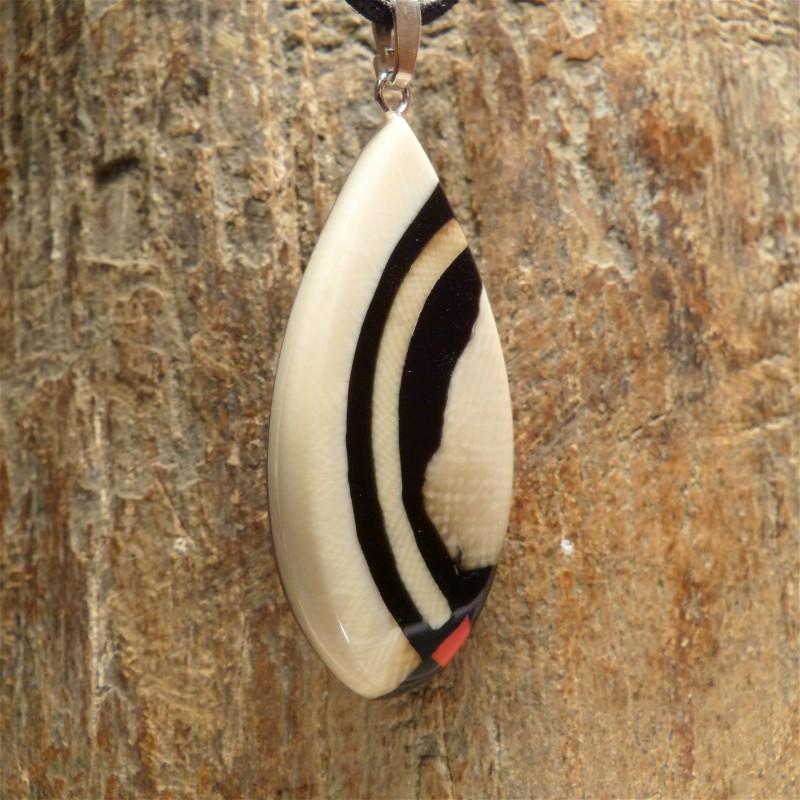 Tropfenanhänger aus cremefarbenem Mammut-Elfenbein mit feiner Maserung und einer kleinen Intarsie aus rekonstruierter Koralle. Er hat ohne Öse eine Größe von ca. 47 x 21 mm und wurde auf der Rückseite zur Stabilisierung mit Nussbaumholz hinterlegt. Die Aufhängung aus 925/-er Silber eignet sich für Bänder bis ca. 2,5 mm. Passende Bänder können Sie unter Zubehör separat bestellen.