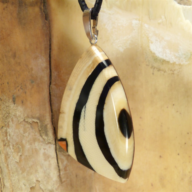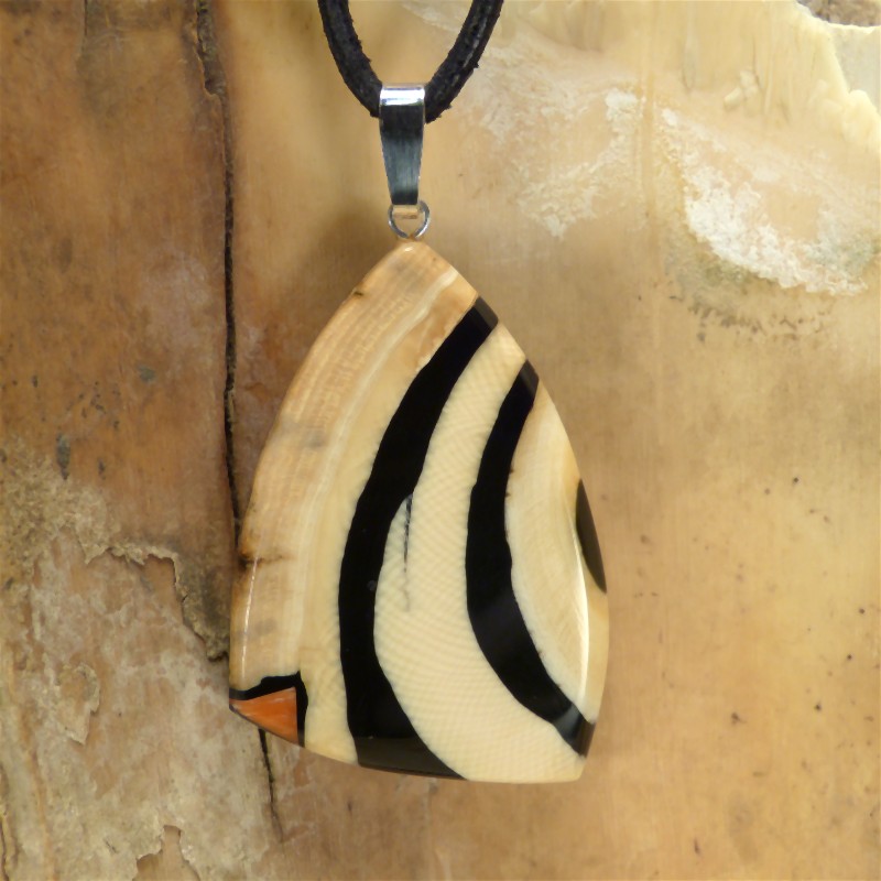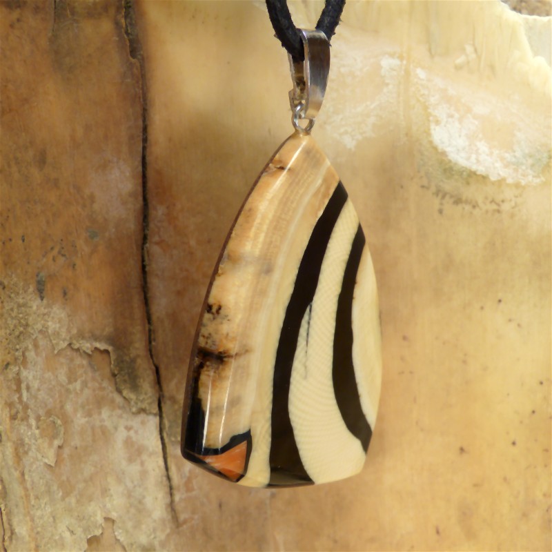 Mammut-Elfenbein mit brauner Rindenfärbung und schöner Maserung. Als Intarsie wurde