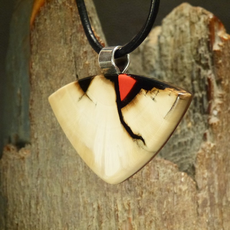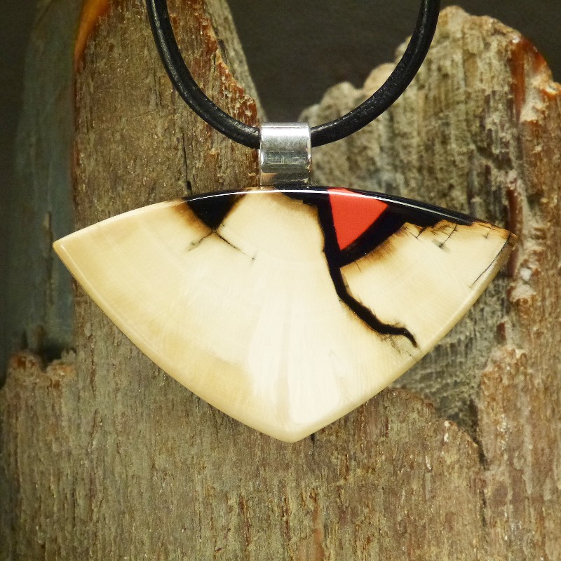 Schöner Quer-Anhänger aus cremefarbenem Mammut-Elfenbein mit feiner Maserung und einer Intarsie aus rekonstruierter Koralle.