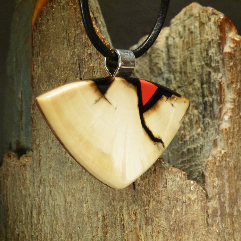 Der Anhänger hat ohne Öse eine Größe von ca. 33 x 66 mm und ist auf der Rückseite zur Stabilisierung mit Nussbaumholz hinterlegt.
