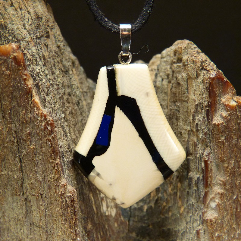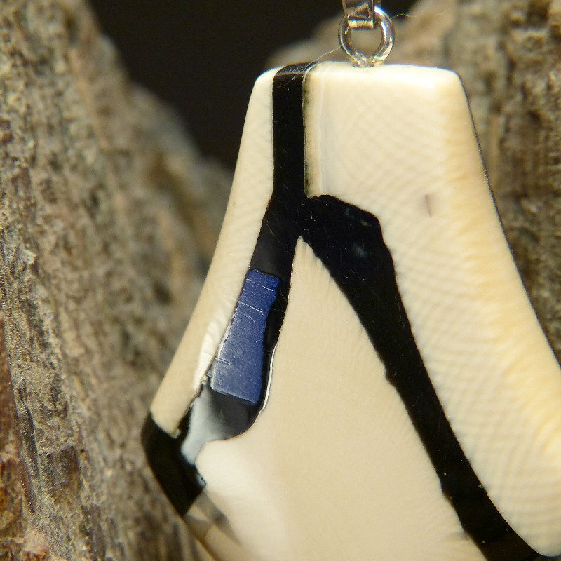 Anhänger aus cremefarbenem Mammut-Elfenbein mit schöner Maserung und einer Intarsie aus rekonstruiertem Lapislazuli. Der Anhänger hat eine Größe von ca. 38x 30 mm (ohne Öse) und wurde zur Stabilisierung mit Nussbaumholz hinterlegt. Die Öse aus 925/-er Silber ist geeignet für Ketten oder Bänder bis zu einer Größe von ca. 3 mm. Die Lieferung erfolgt ohne Band, dieses können Sie unter Zubehör separat bestellen.