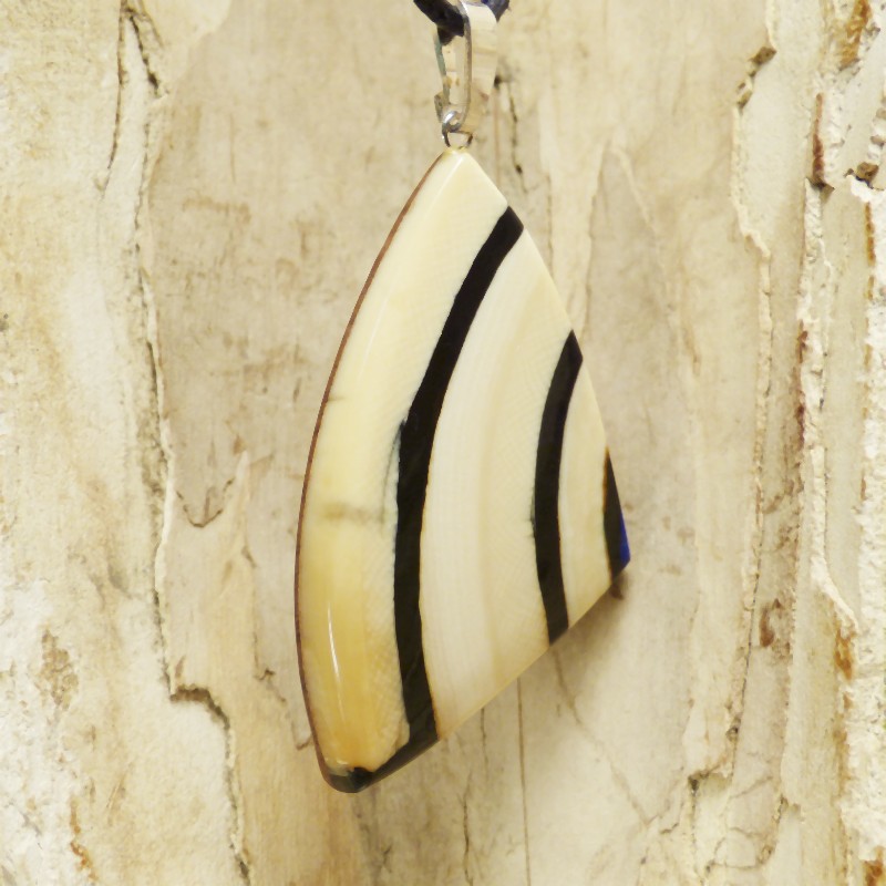 Cremefarbener Anhänger aus schön gemasertem Mammut-Elfenbein mit einer kleinen Intarsie aus dunkelblauem,