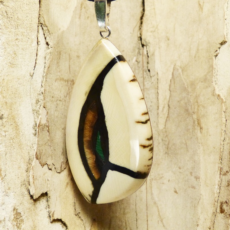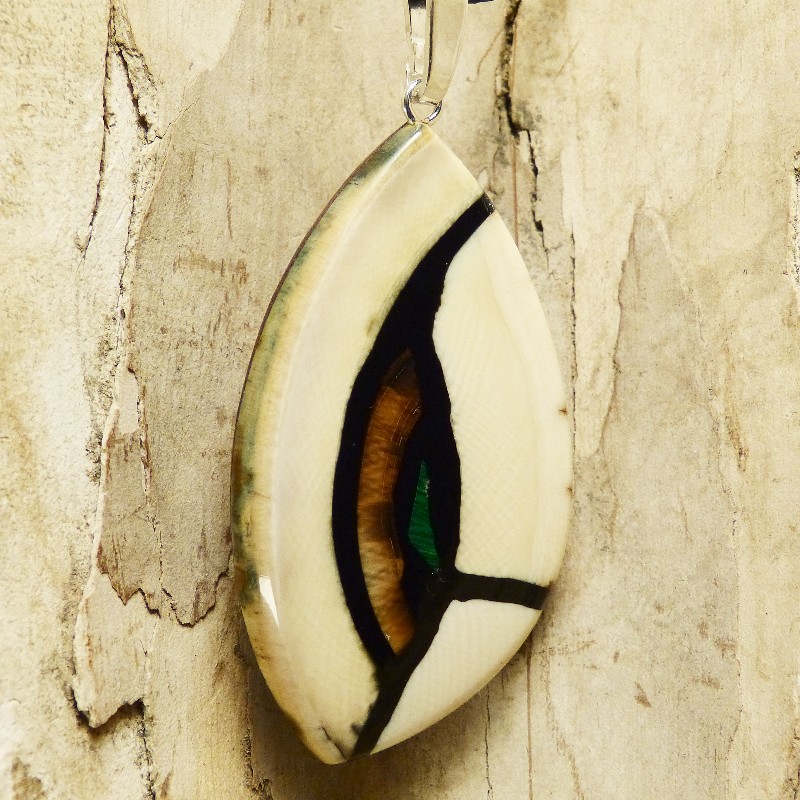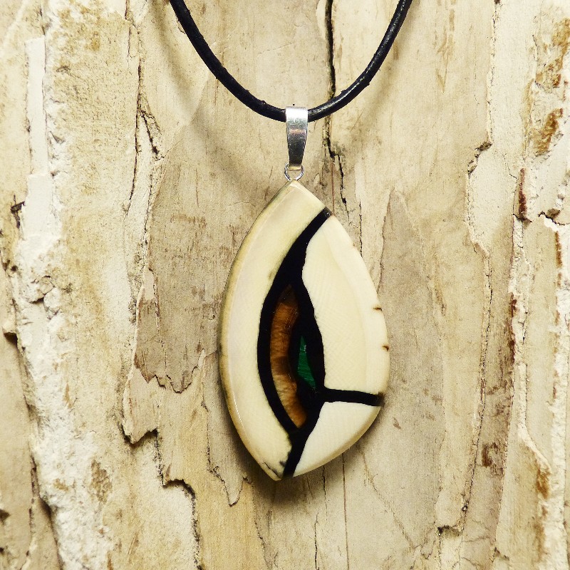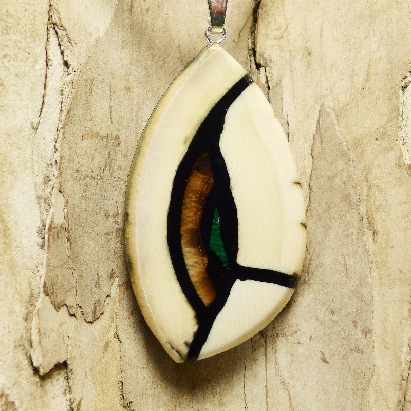 Schöner Anhänger aus fein gemasertem Mammut-Elfenbein mit grünlich/blauer Außenrinde. Zusätzlich wurde als Intarsie ein kleiner dunkelgrüner Malachit eingearbeitet.
