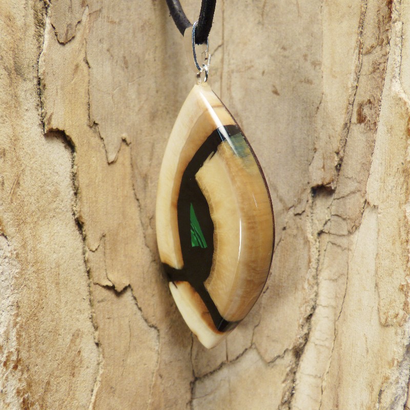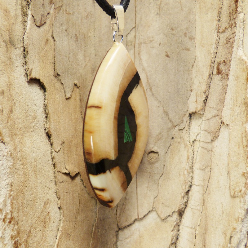 Stabilisierung mit Nussbaumholz hinterlegt. Die Öse aus 925/-er Silber ist geeignet für Ketten oder Bänder bis zu einer Größe von ca. 3 mm. Die Lieferung erfolgt ohne