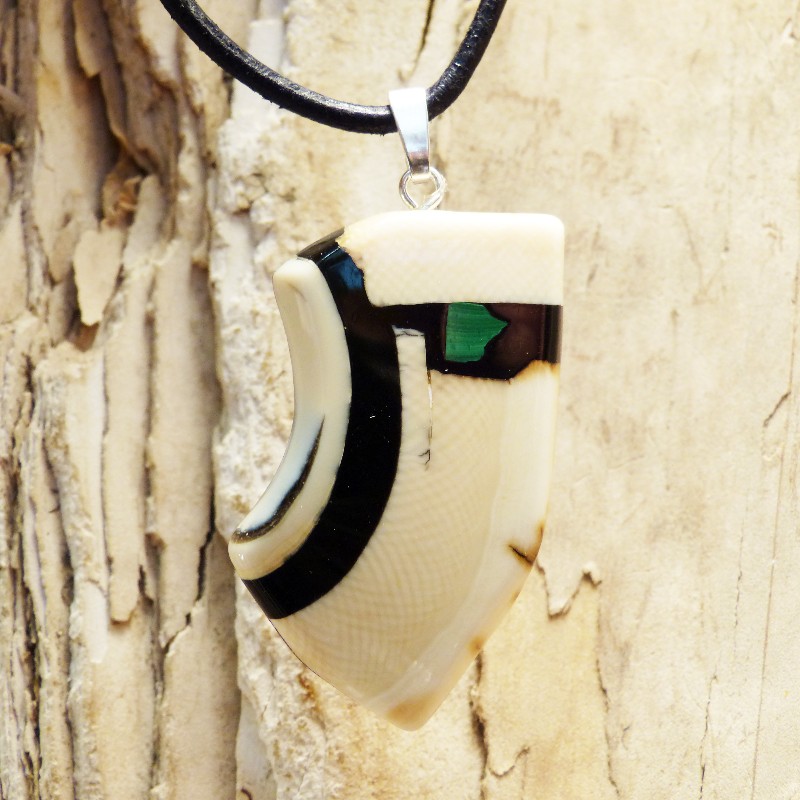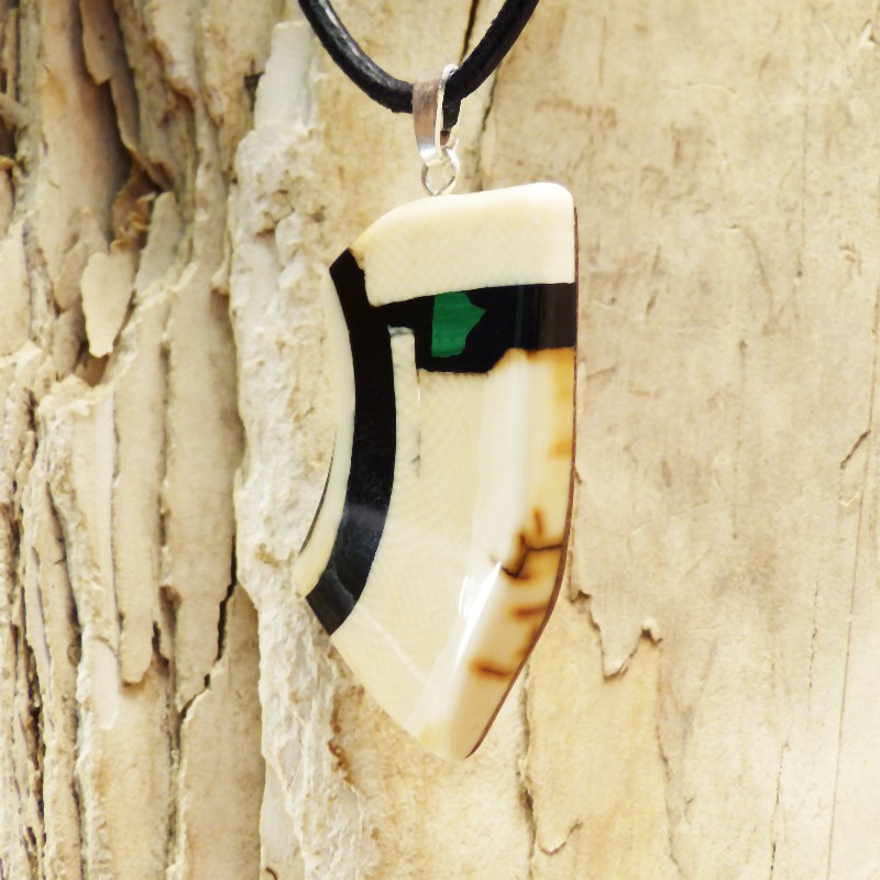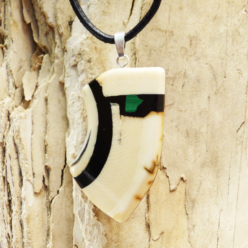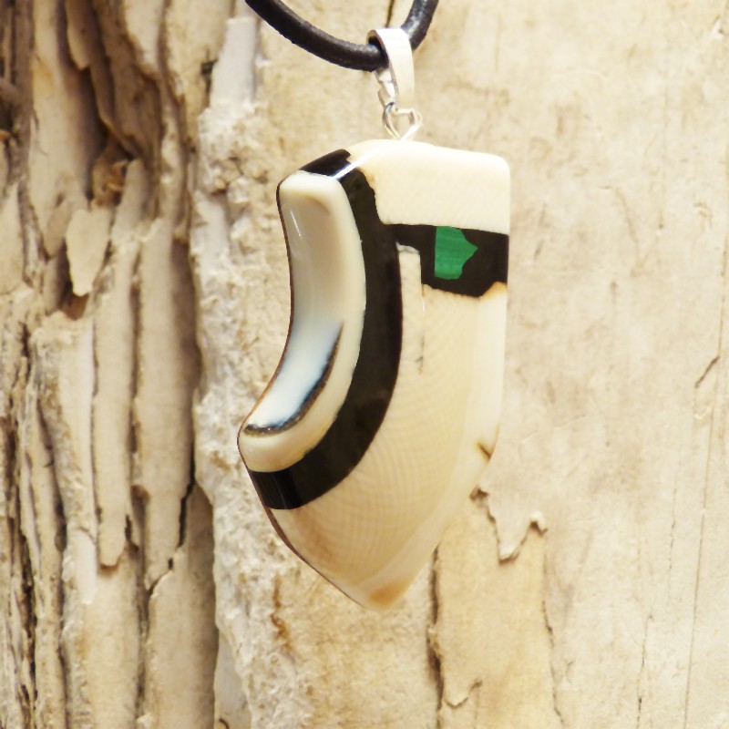Asymetrisch geschliffener Anhänger aus cremefarbenem Mammut-Elfenbein mit ausgeprägter Maserung und leichter Außenrinde. Als Intarsie wurde zusätzlich ein