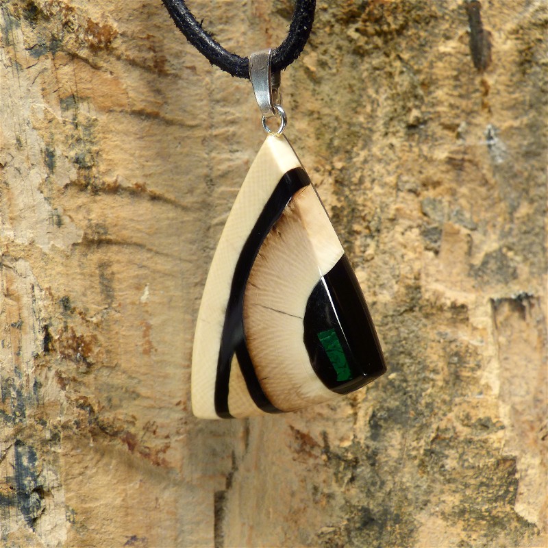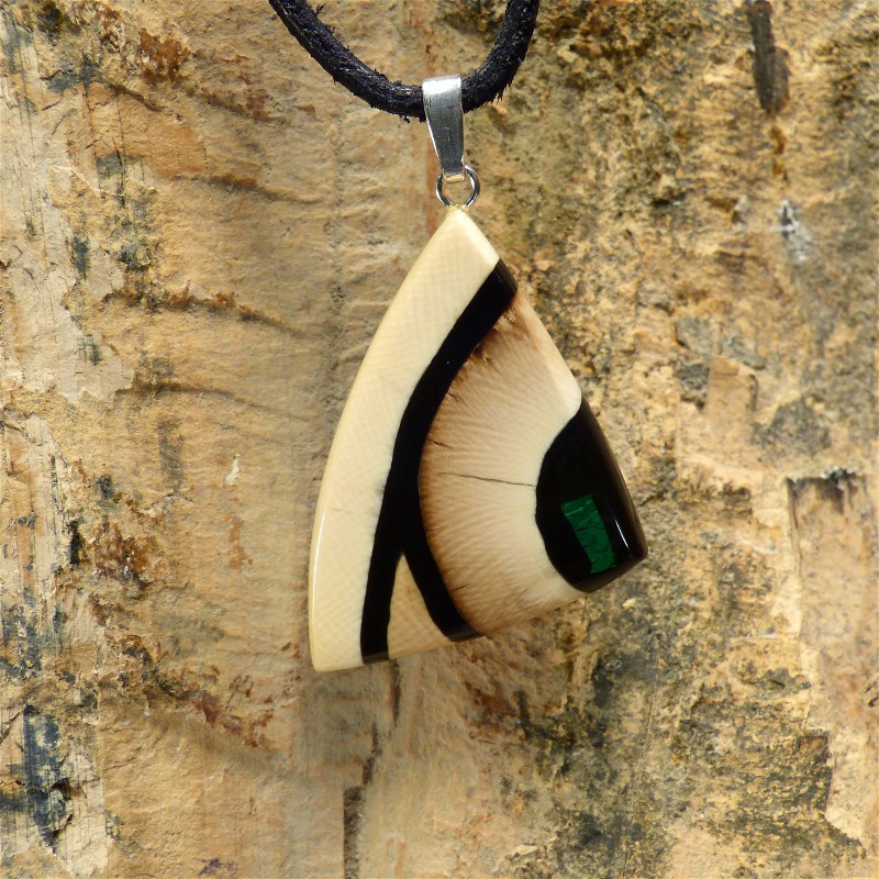 Dreieckig geschliffener Anhänger aus cremefarbenem/bräunlichem Mammut-Elfenbein mit feiner Maserung und einer Intarsie aus