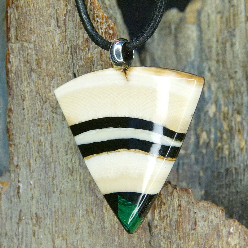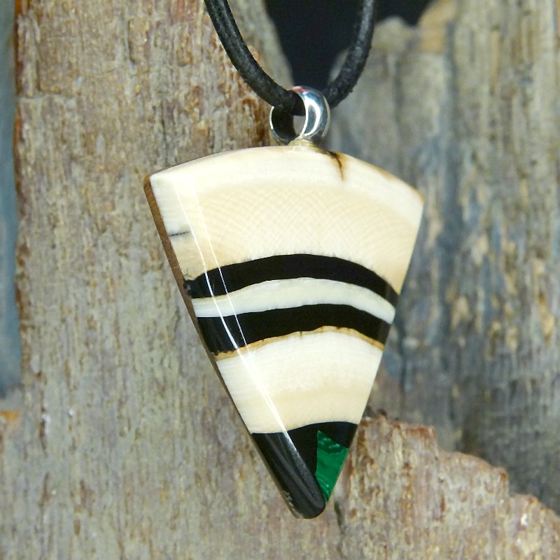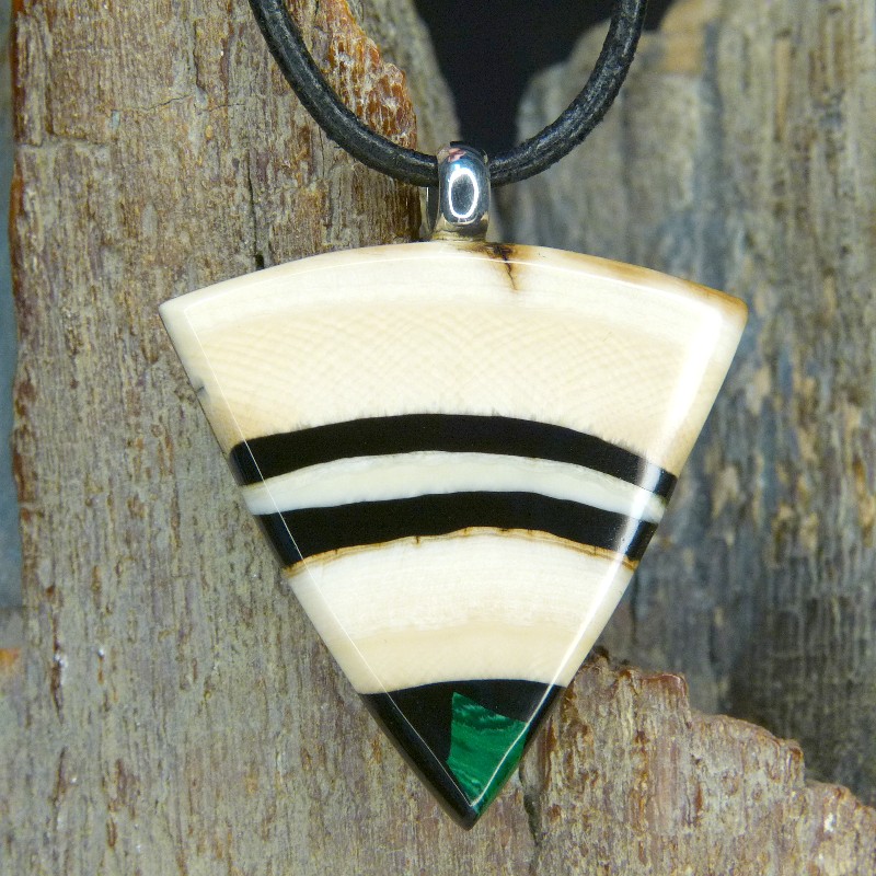 Dreieckig geschliffener Anhänger aus cremigem Mammut-Elfenbein mit feiner Maserung. Als Intarsie wurde zusätzlich ein grüner rekonstruierter Malachit eingearbeitet.